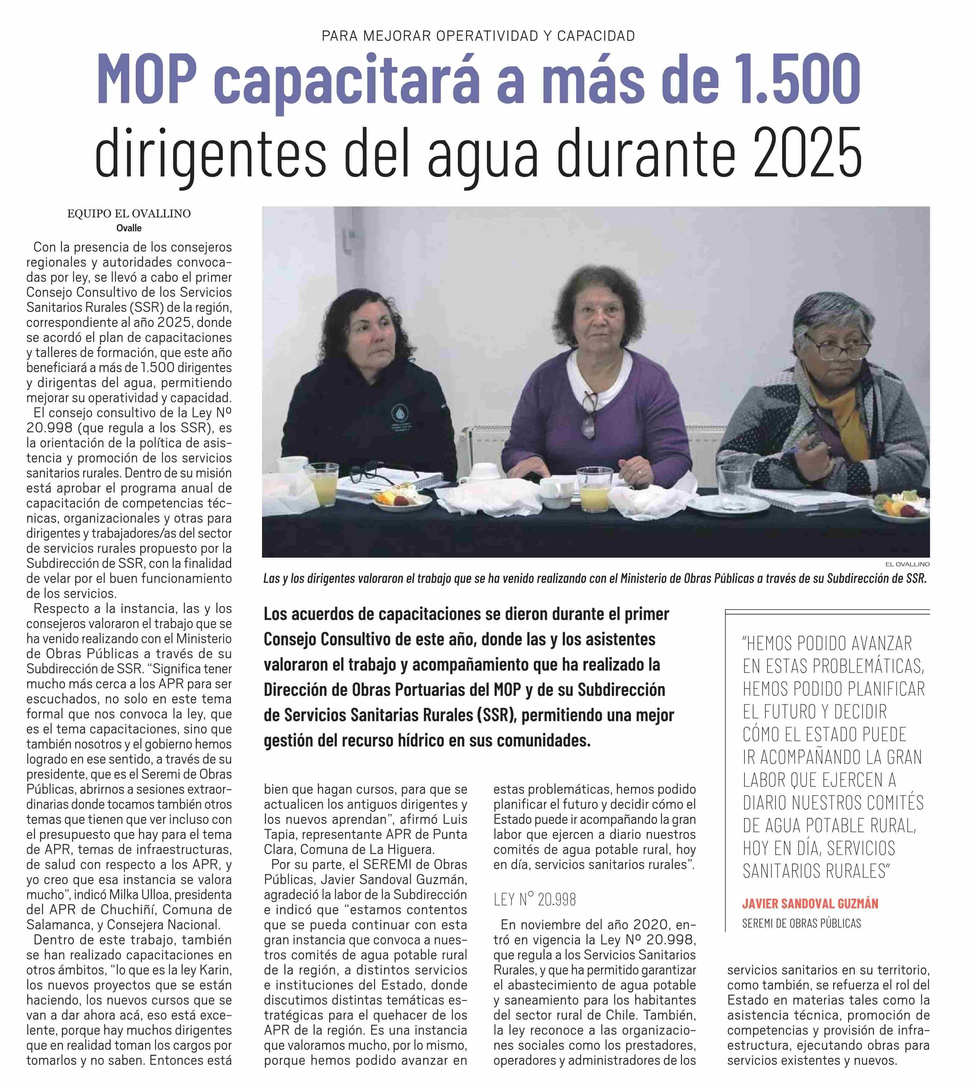 MOP capacitará a más de 1.500 dirigentes del agua durante 2025 09-06-2025 El Ovallino |