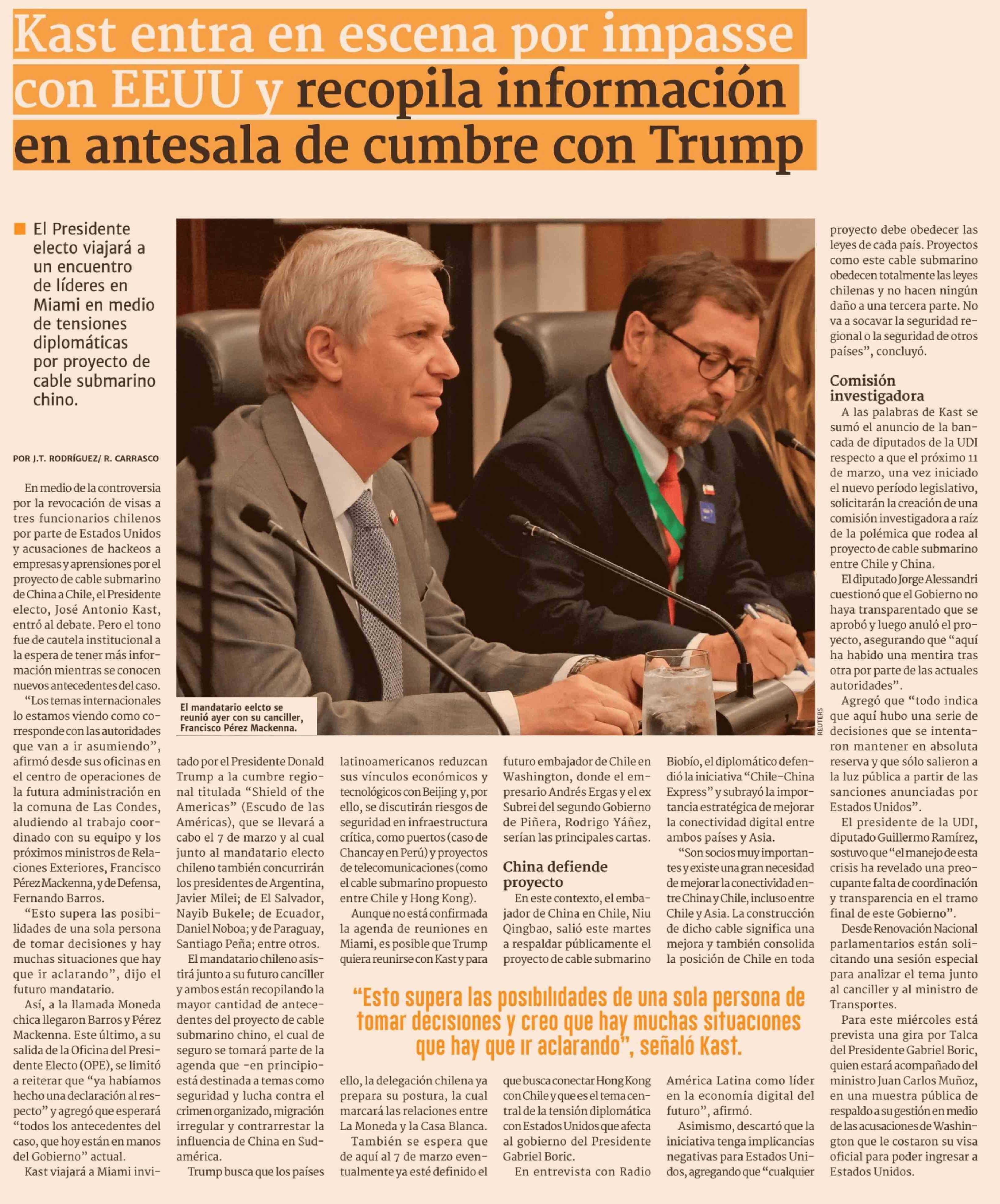 Kast entra en escena por impasse con EEUU y recopila información en antesala de cumbre con Trump 25-02-2026 Diario Financiero |