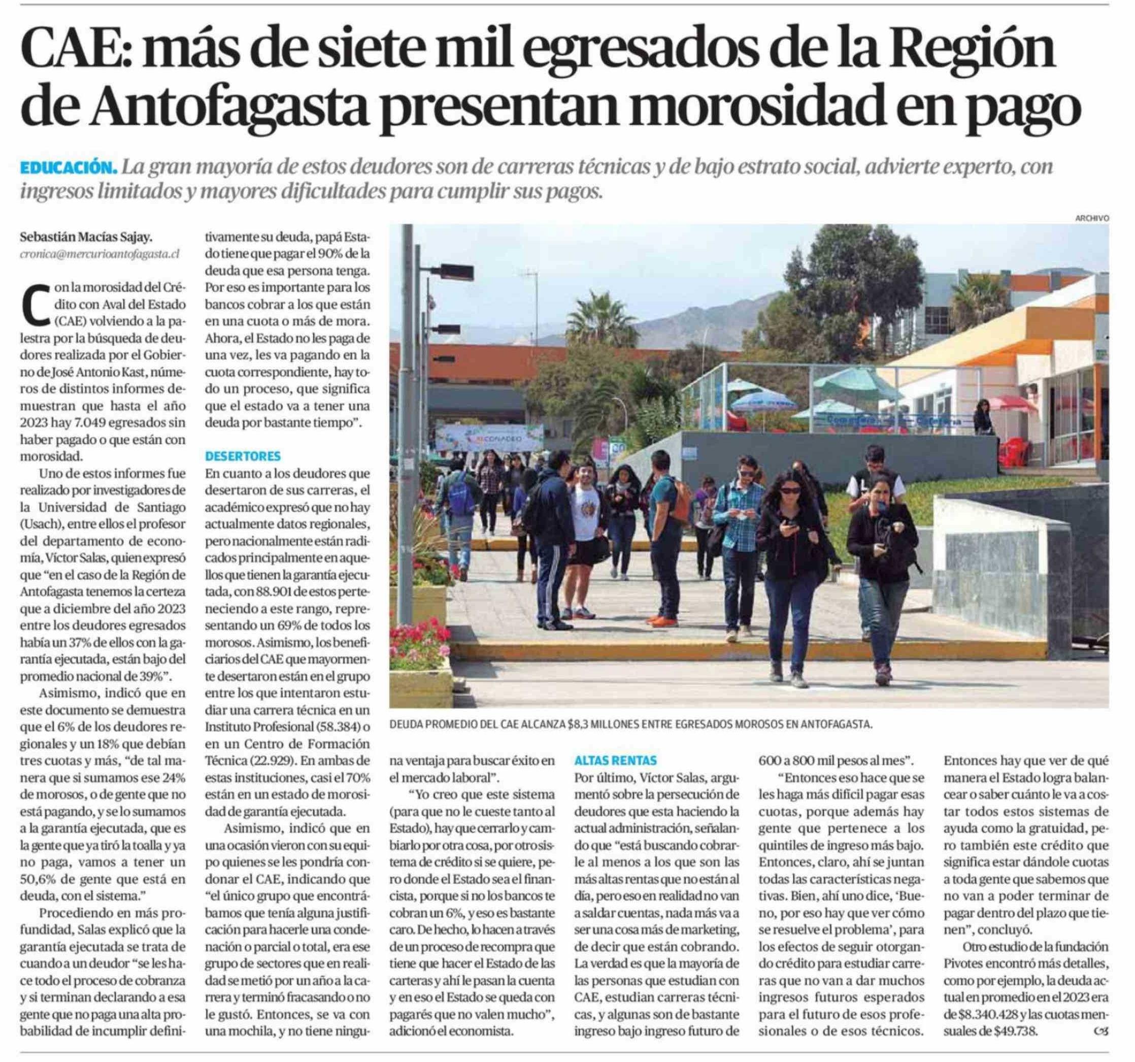 CAE: más de siete mil egresados de la Región de Antofagasta presentan morosidad en pago 03-04-2026 El Mercurio de Calama |