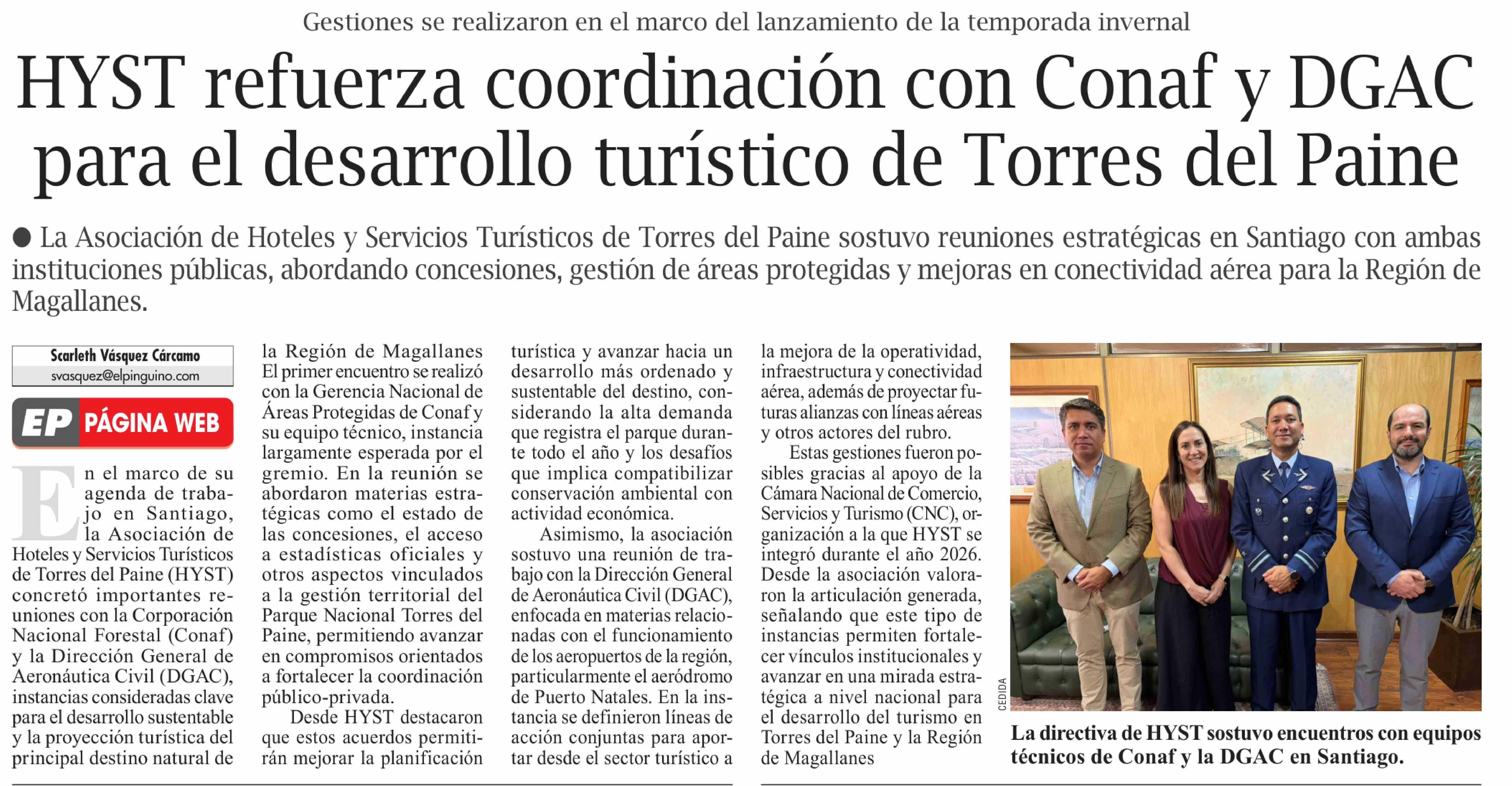 Título: HYST refuerza coordinación con Conaf y DGAC para el desarrollo turístico de Torres del Paine