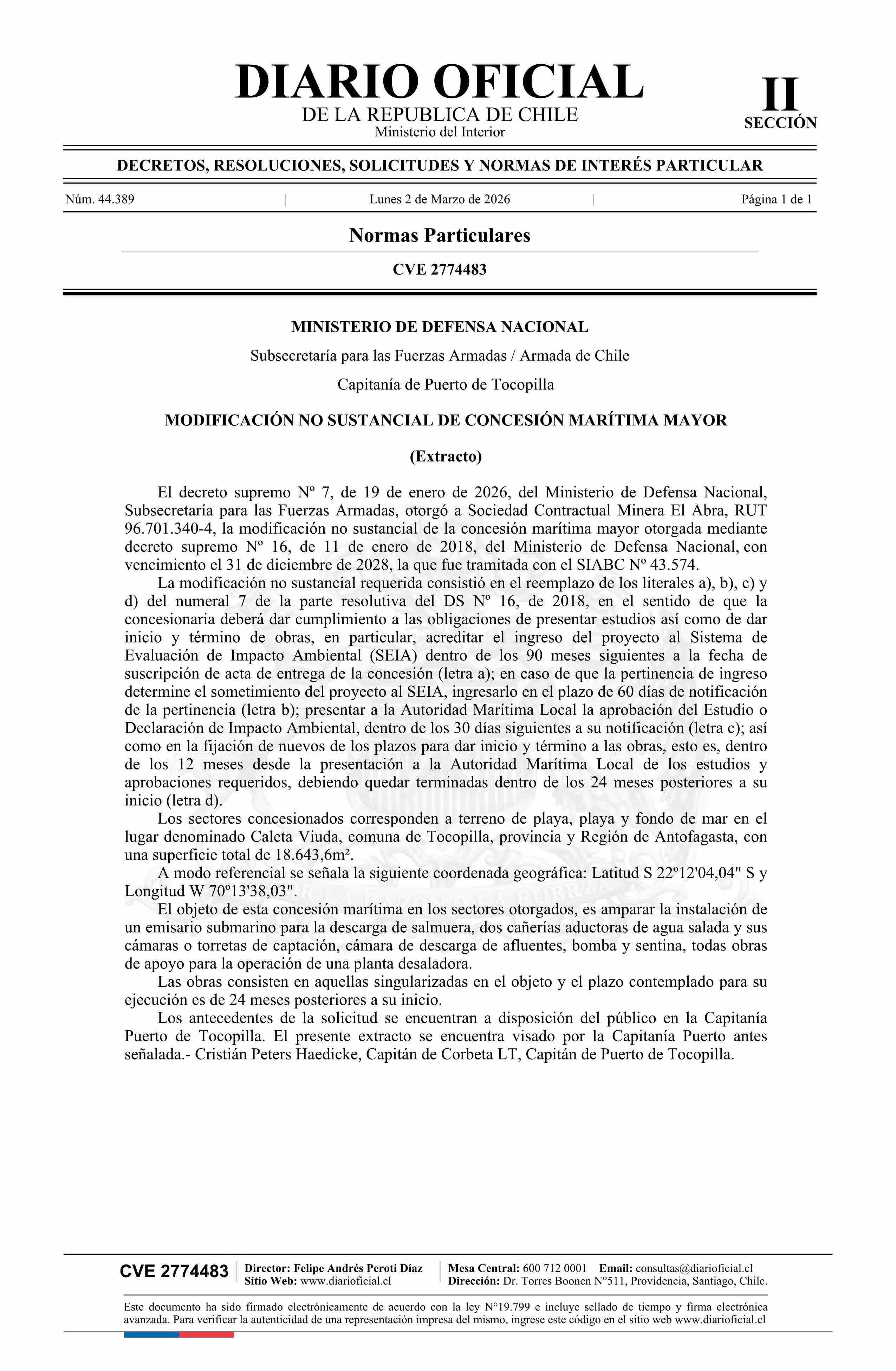 | Título: | Extracto de decreto número 7, de 2026.- Modificación no sustancial de concesión marítima mayor |
