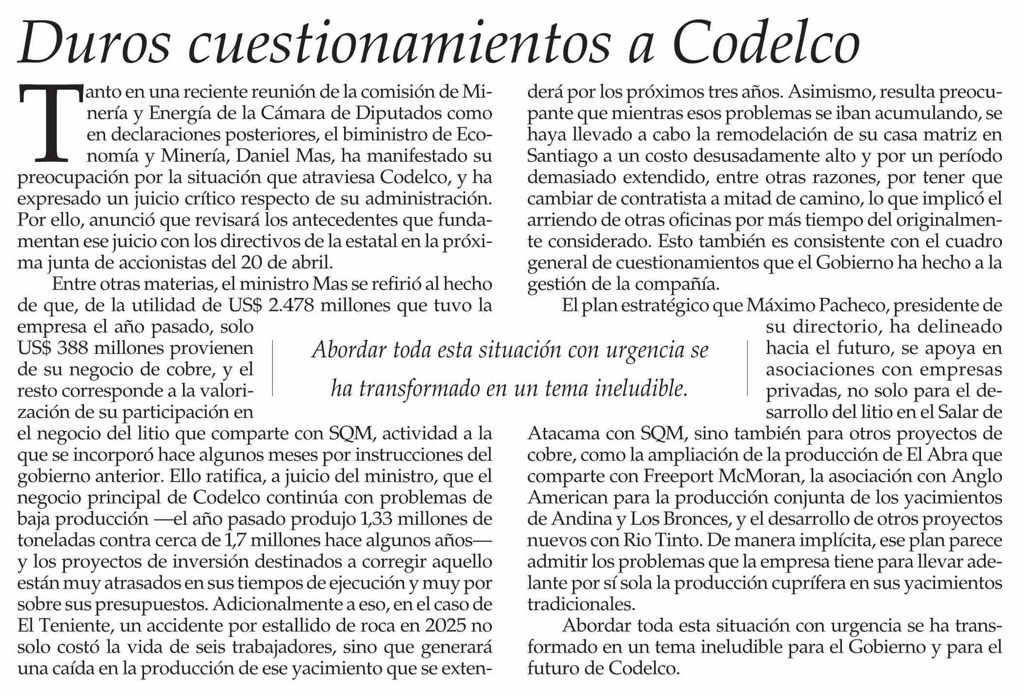 Editorial: Duros cuestionamientos a Codelco 11-04-2026 El Mercurio |