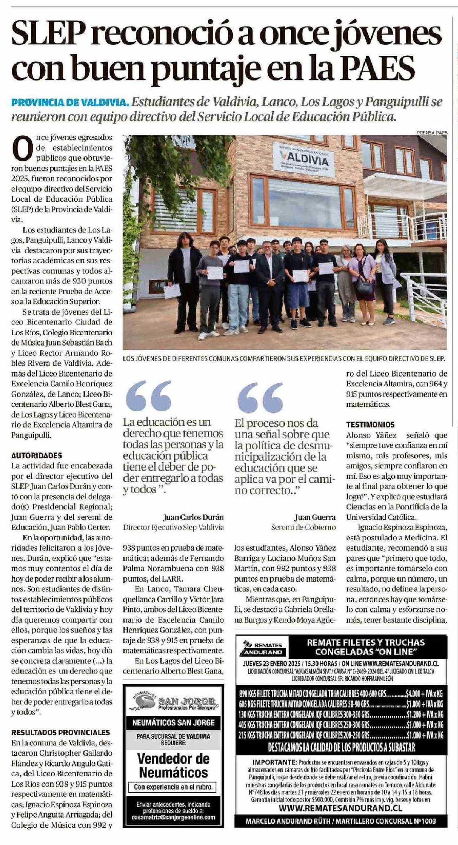 SLEP reconoció a once jóvenes con buen puntaje en la PAES 17-01-2025 Diario Austral Región de Los Ríos |