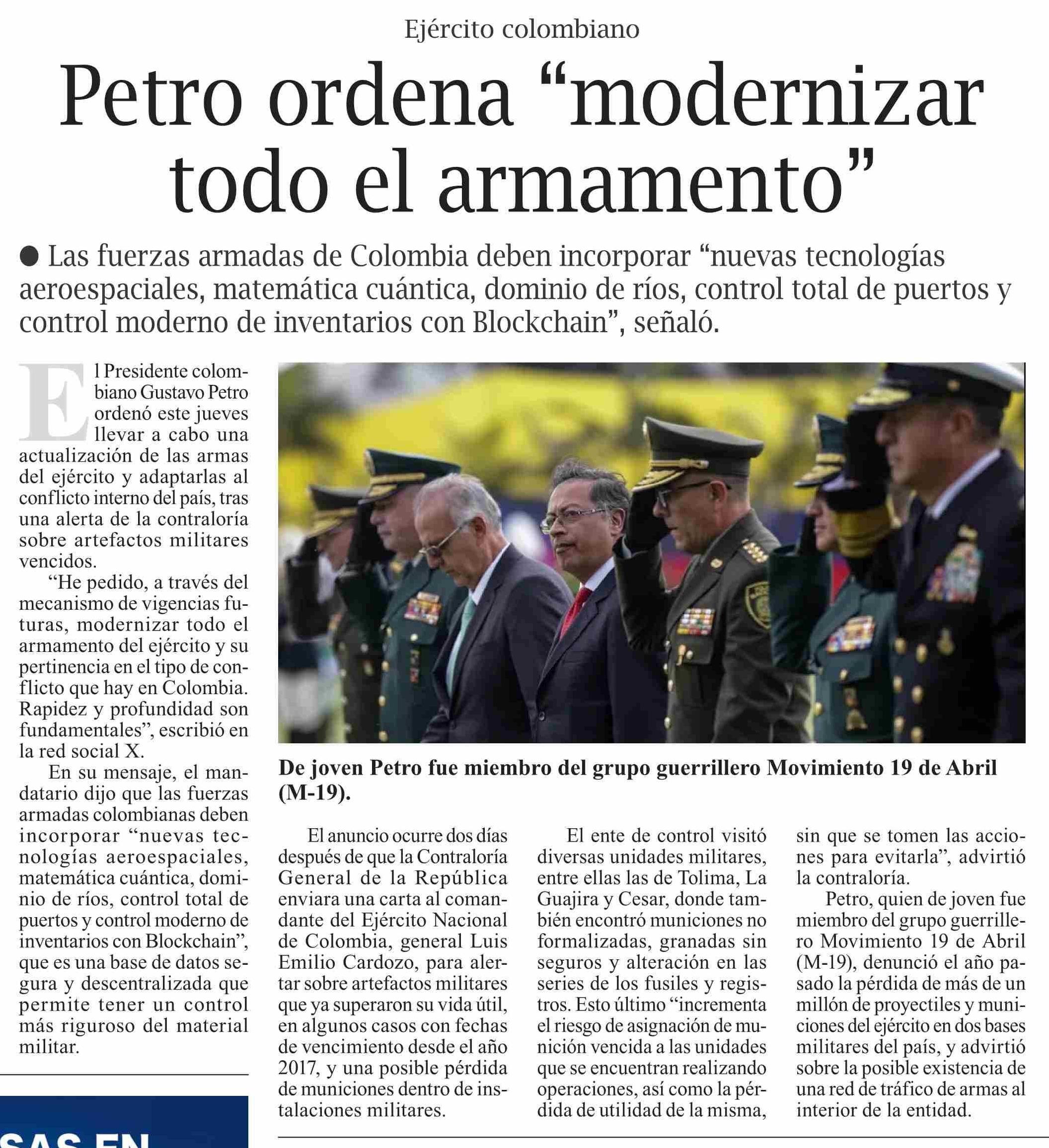 | Título: | Petro ordena “modernizar todo el armamento” |