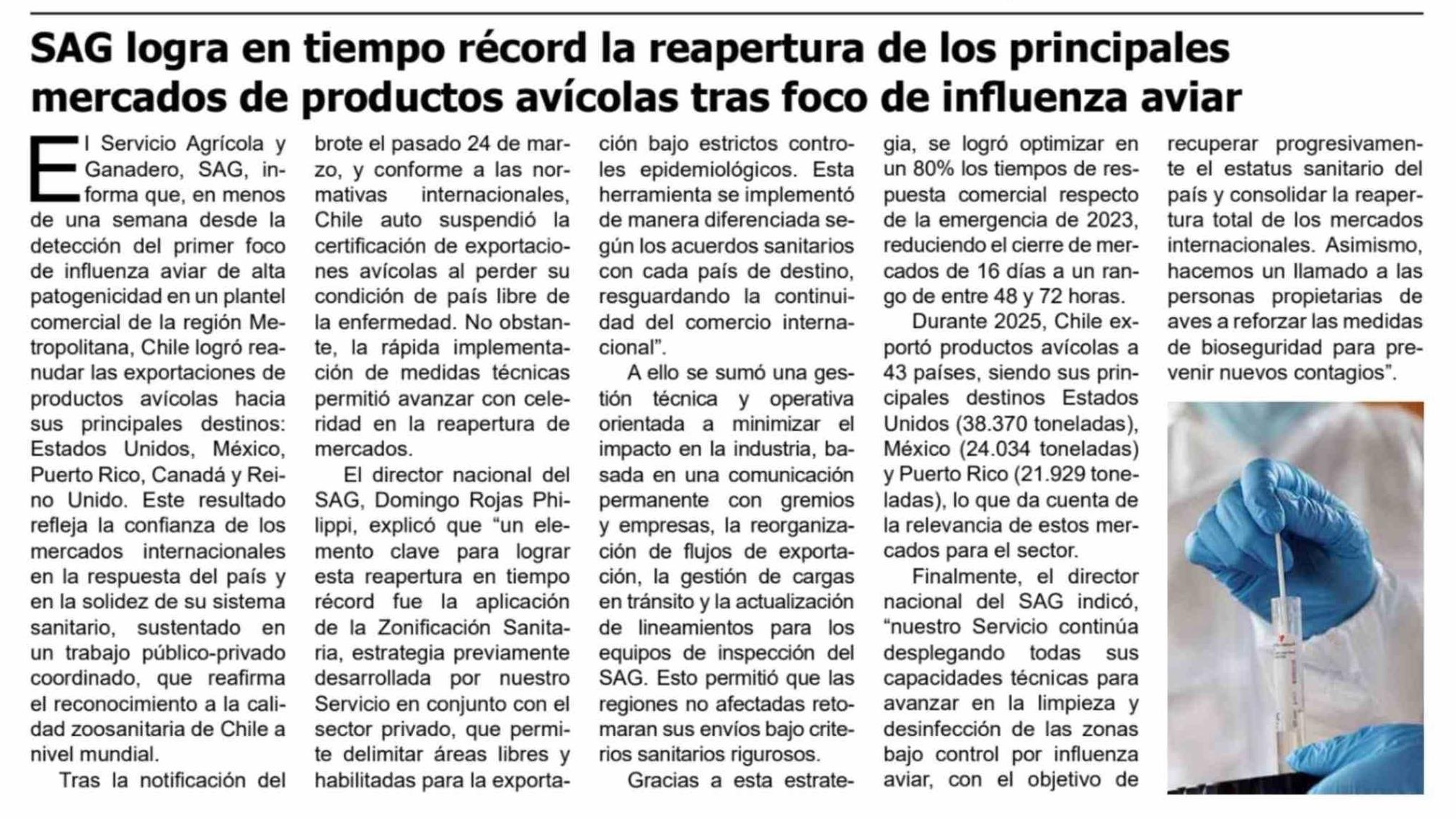 Título: SAG logra en tiempo record la reapertura de los principales mercados de productos avícolas tras foco de influenza aviar