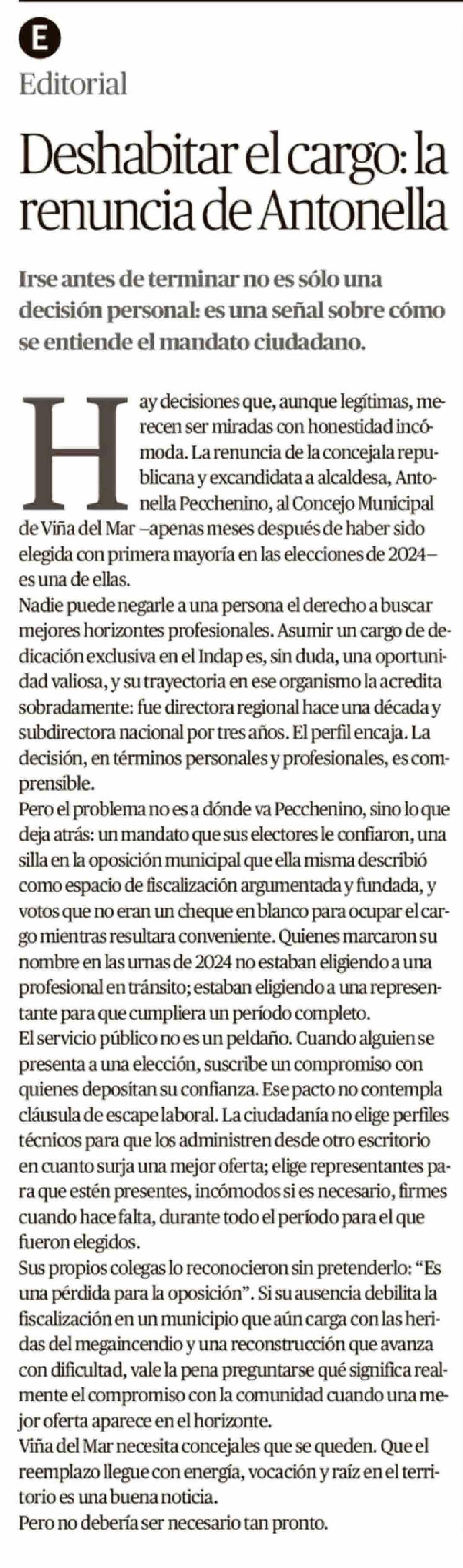 Editorial: Deshabitar el cargo: la renuncia de Antonella 14-03-2026 El Mercurio de Valparaíso |