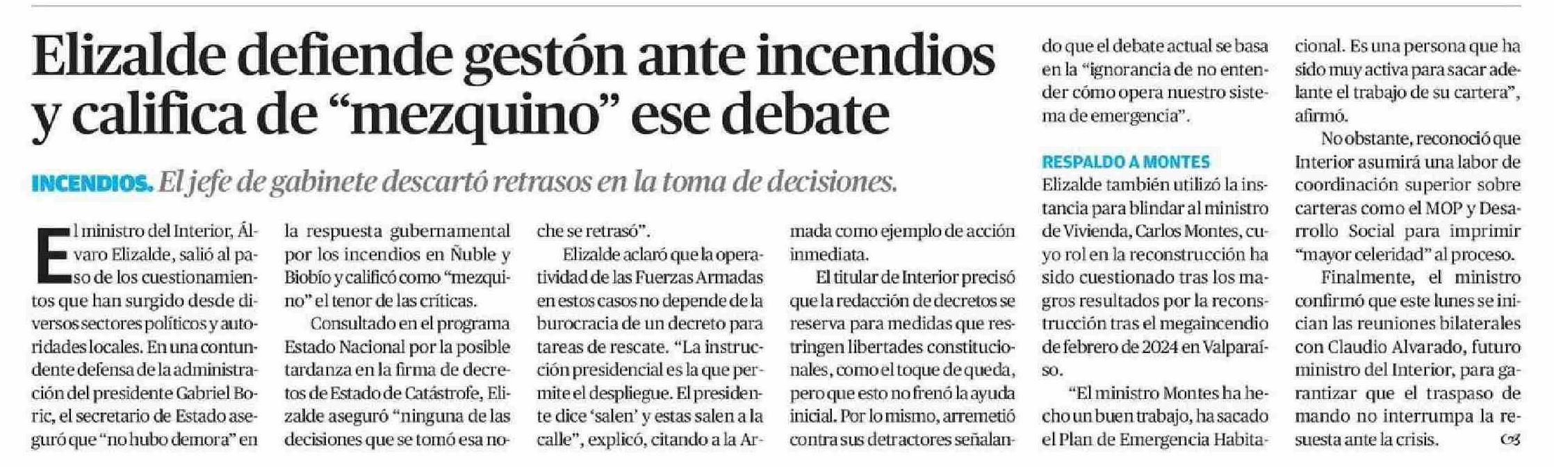 Elizalde defiende gestón ante incendios y califica de "mezquino" ese debate 26-01-2026 El Diario de Atacama |
