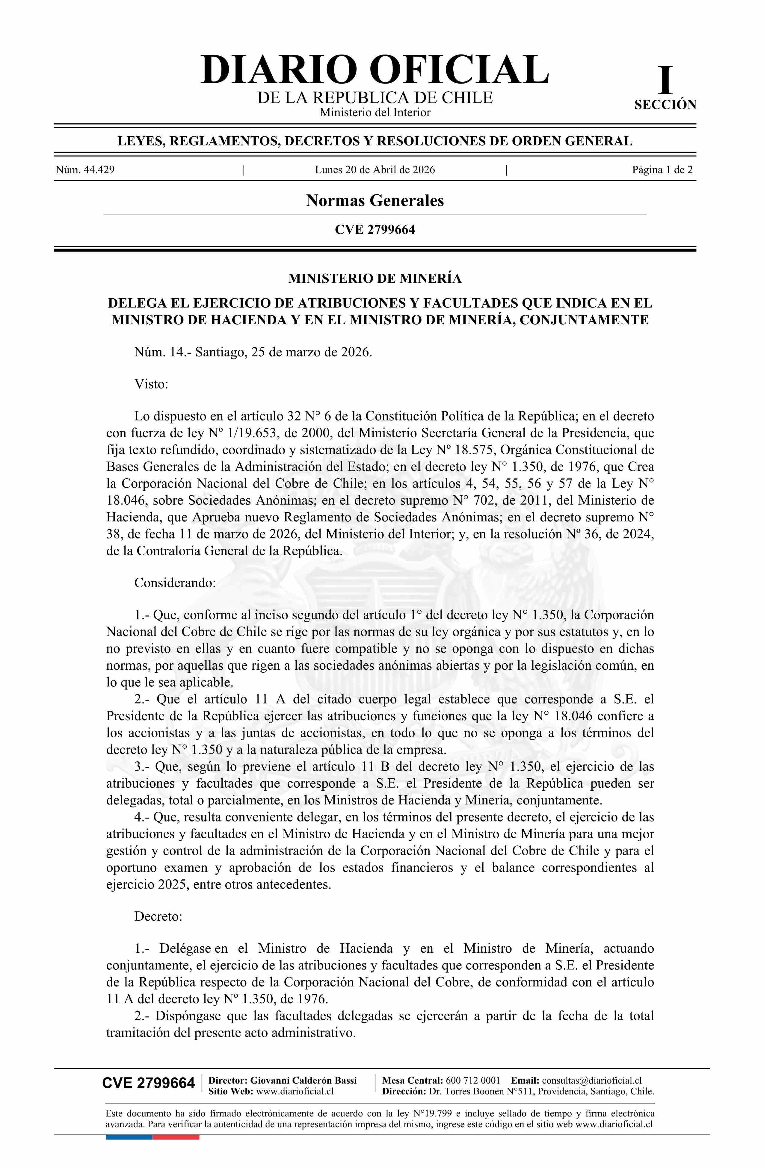 Decreto número 14, de 2026.- Delega el ejercicio de atribuciones y facultades que indica en el Ministro de Hacienda y en el Ministro de Minería, conjuntamente 20-04-2026 Diario Oficial Edición Electrónica |