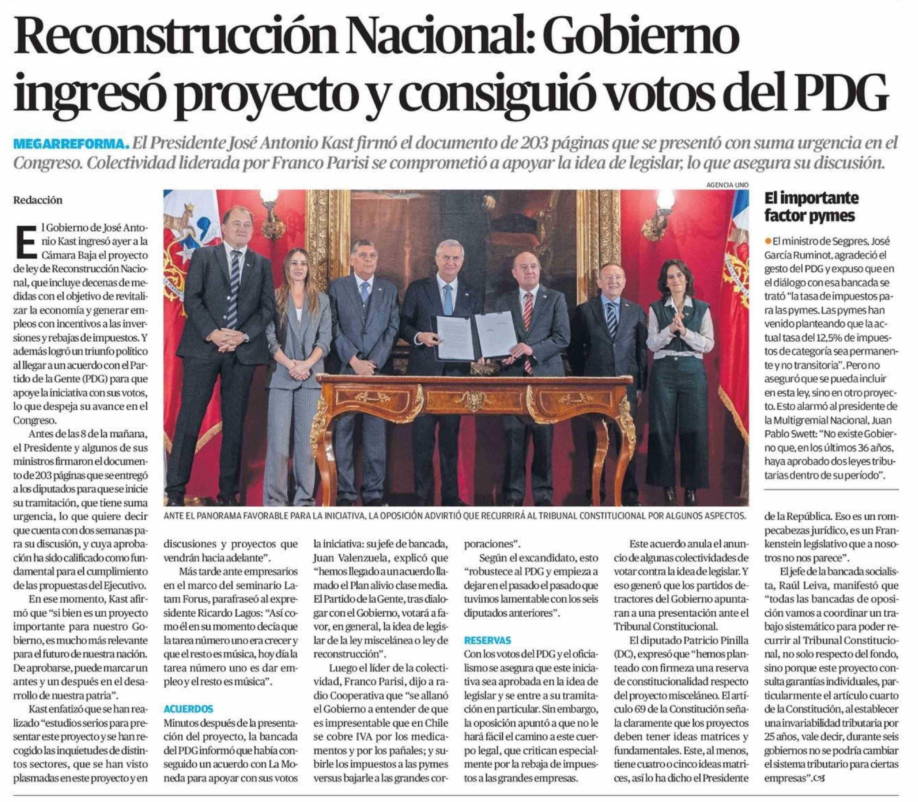Reconstrucción Nacional: Gobierno ingresó proyecto y consiguió votos del PDG 23-04-2026 El Mercurio de Antofagasta |