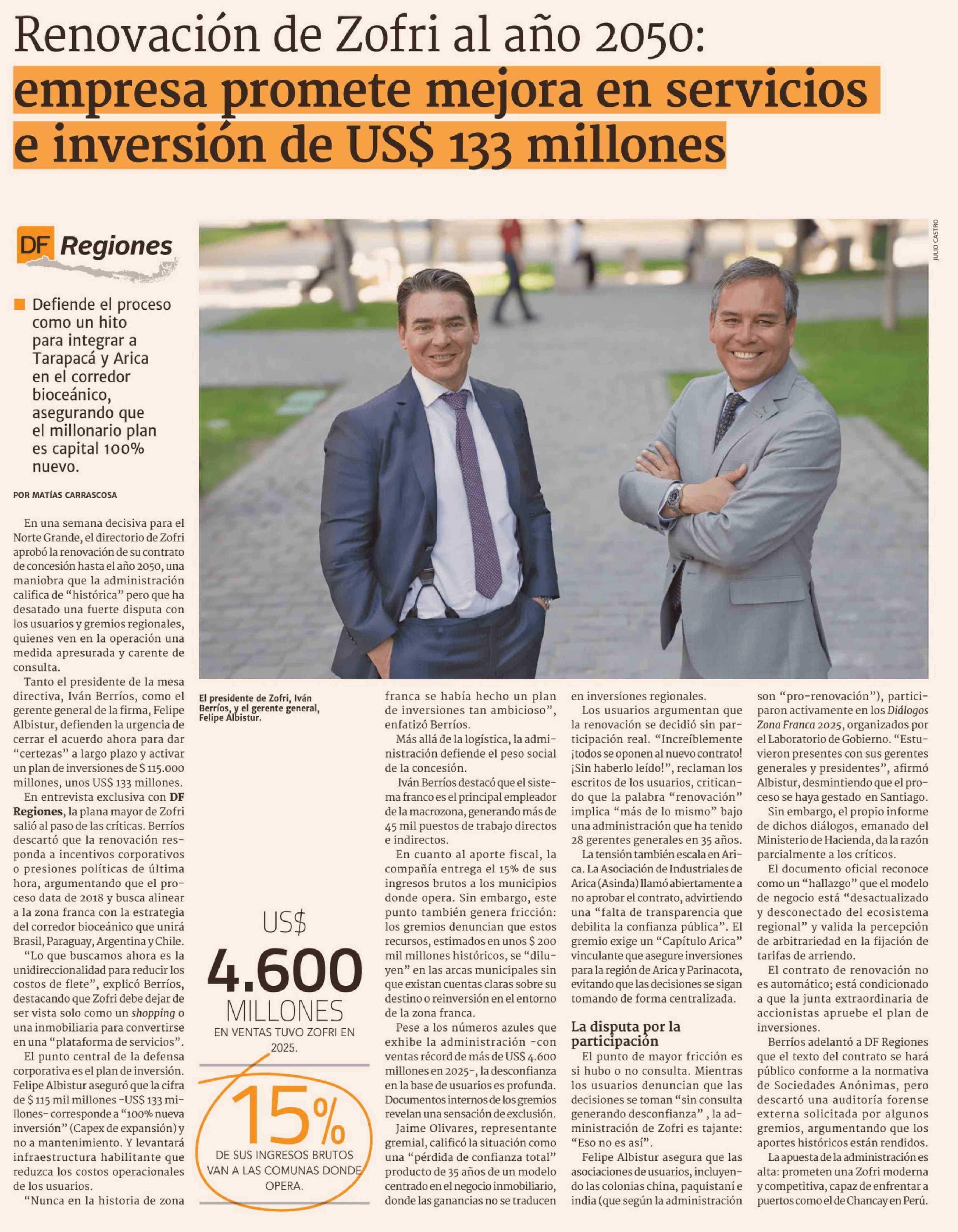 Renovación de Zofri al año 2050: empresa promete mejora en servicios e inversión de US$ 133 millones 17-02-2026 Diario Financiero |