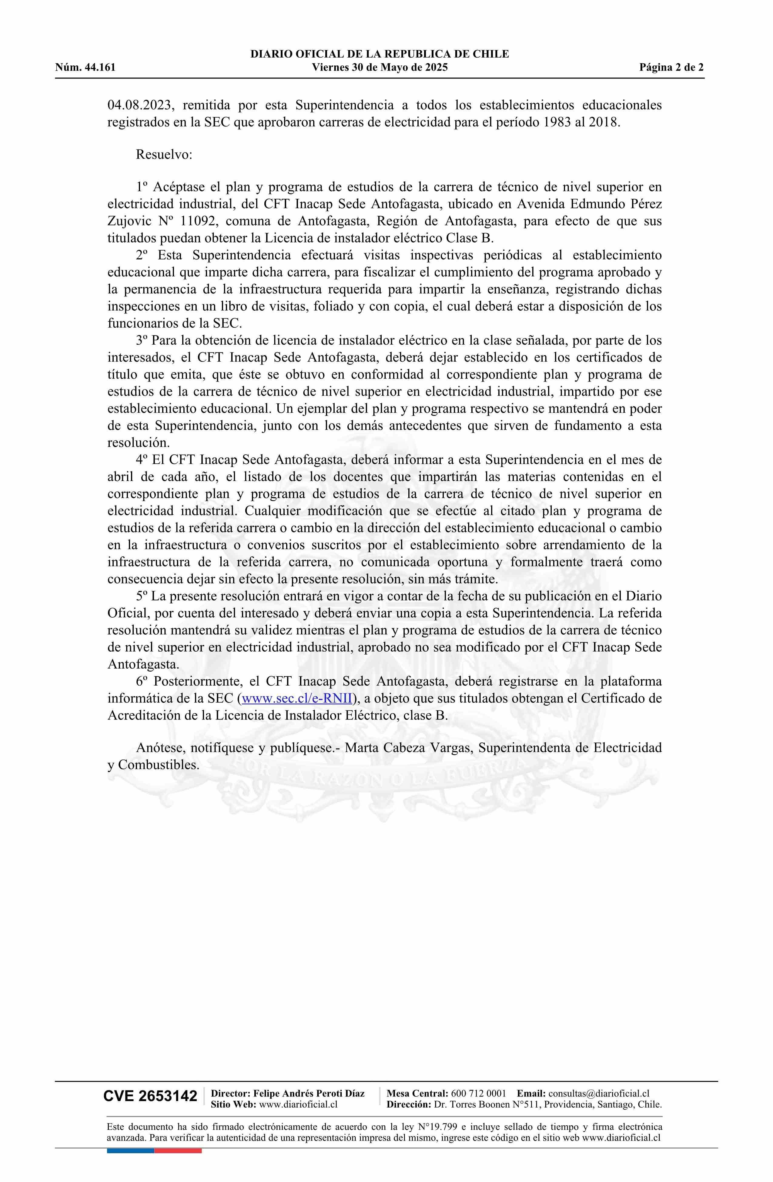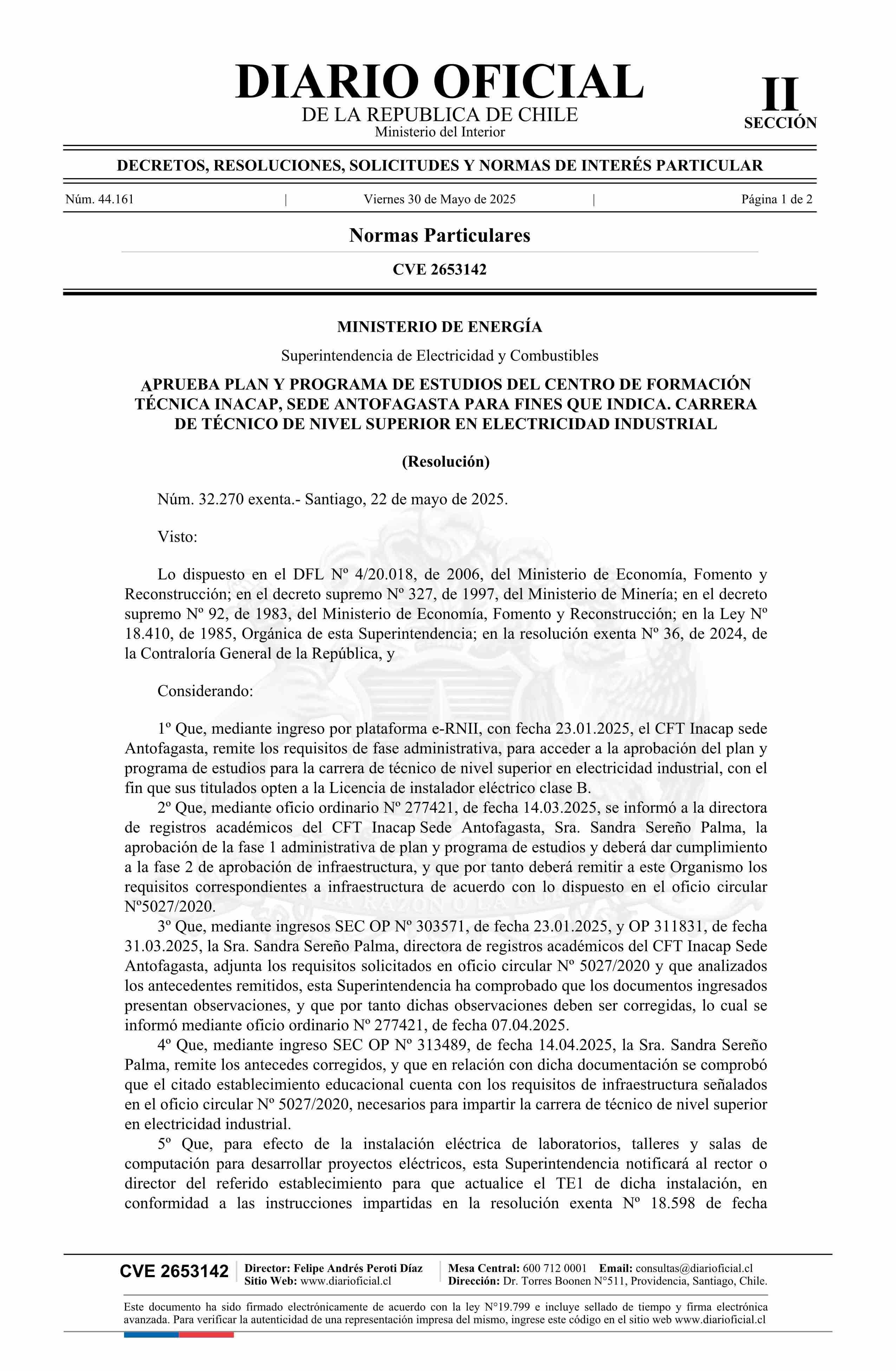 | Título: | Resolución exenta número 32.270, de 2025.- Aprueba plan y programa de estudios de la carrera de Técnico de Nivel Superior en Electricidad Industrial del Centro de Formación Técnica Inacap, sede Antofagasta |