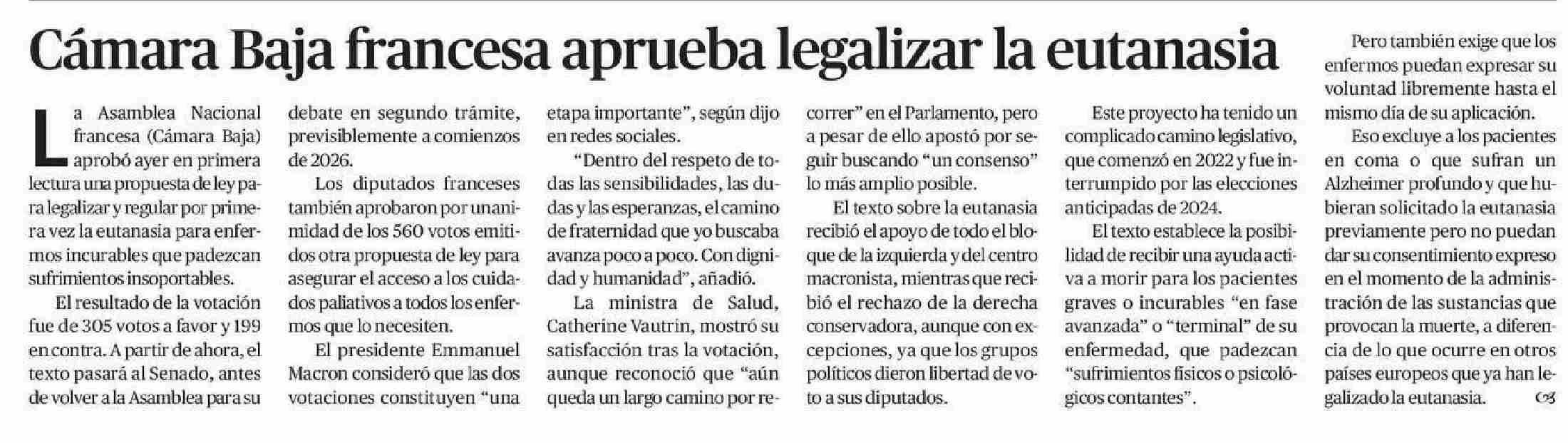 Cámara Baja francesa aprueba legalizar la eutanasia 28-05-2025 El Mercurio de Calama |