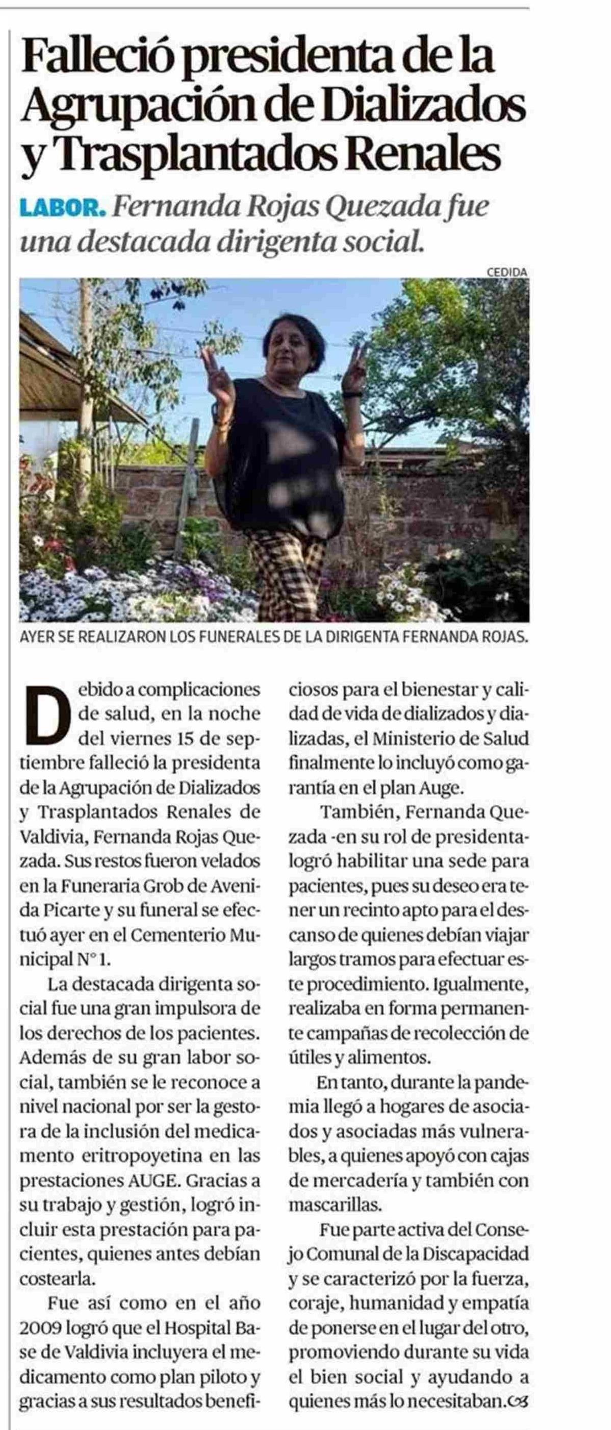 Título: Falleció presidenta de la Agrupación de Dializados y Trasplantados Renales