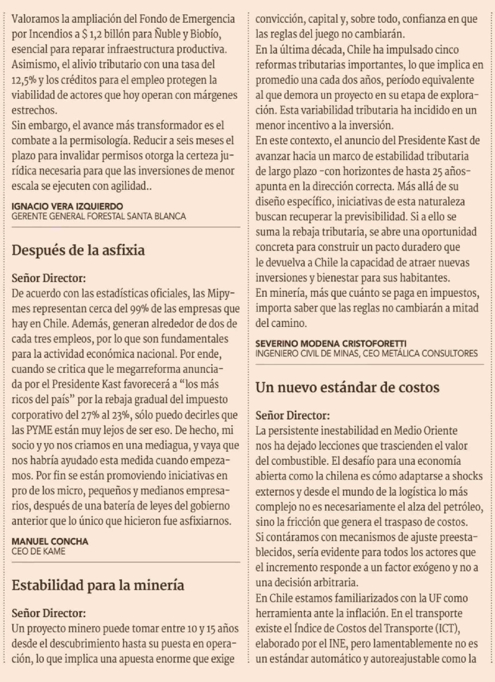 Cartas: Estabilidad para la minería 17-04-2026 Diario Financiero |
