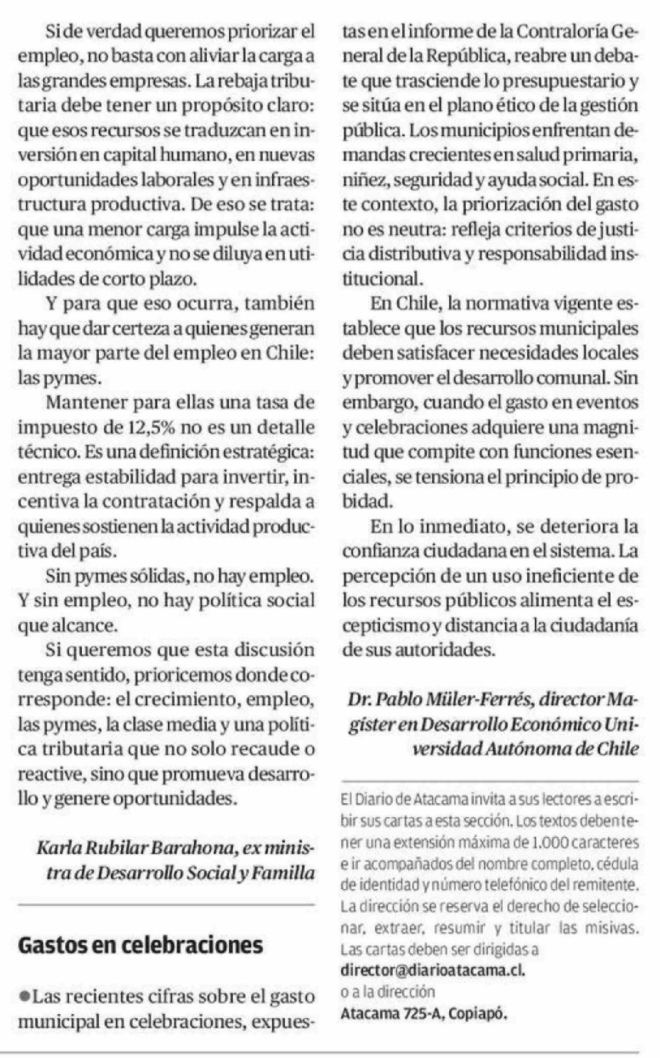 Cartas: Gastos en celebraciones 23-04-2026 El Diario de Atacama |