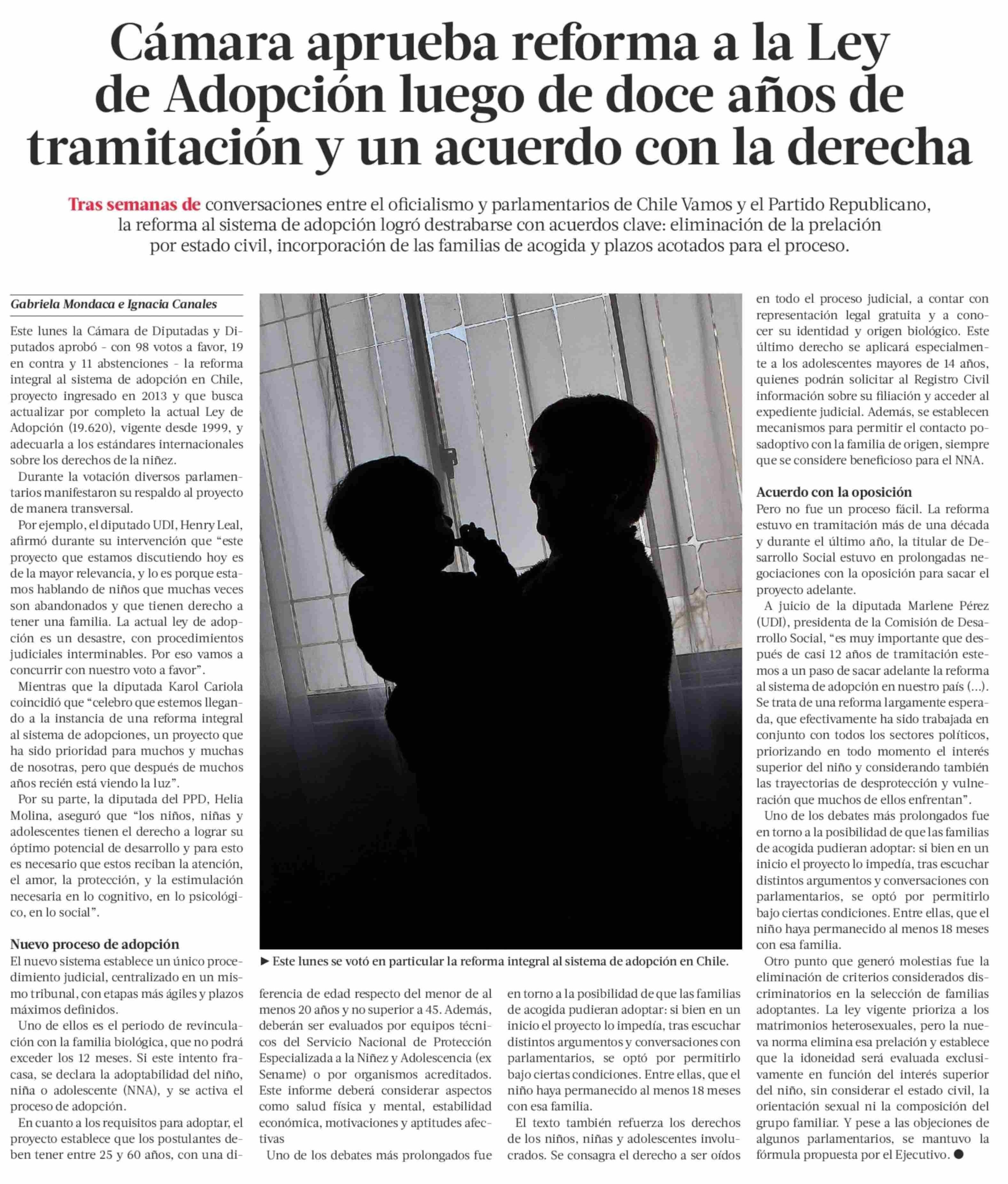 | Título: | Cámara aprueba reforma a La Ley de Adopción luego de doce años de tramitación y un acuerdo con la derecha |
