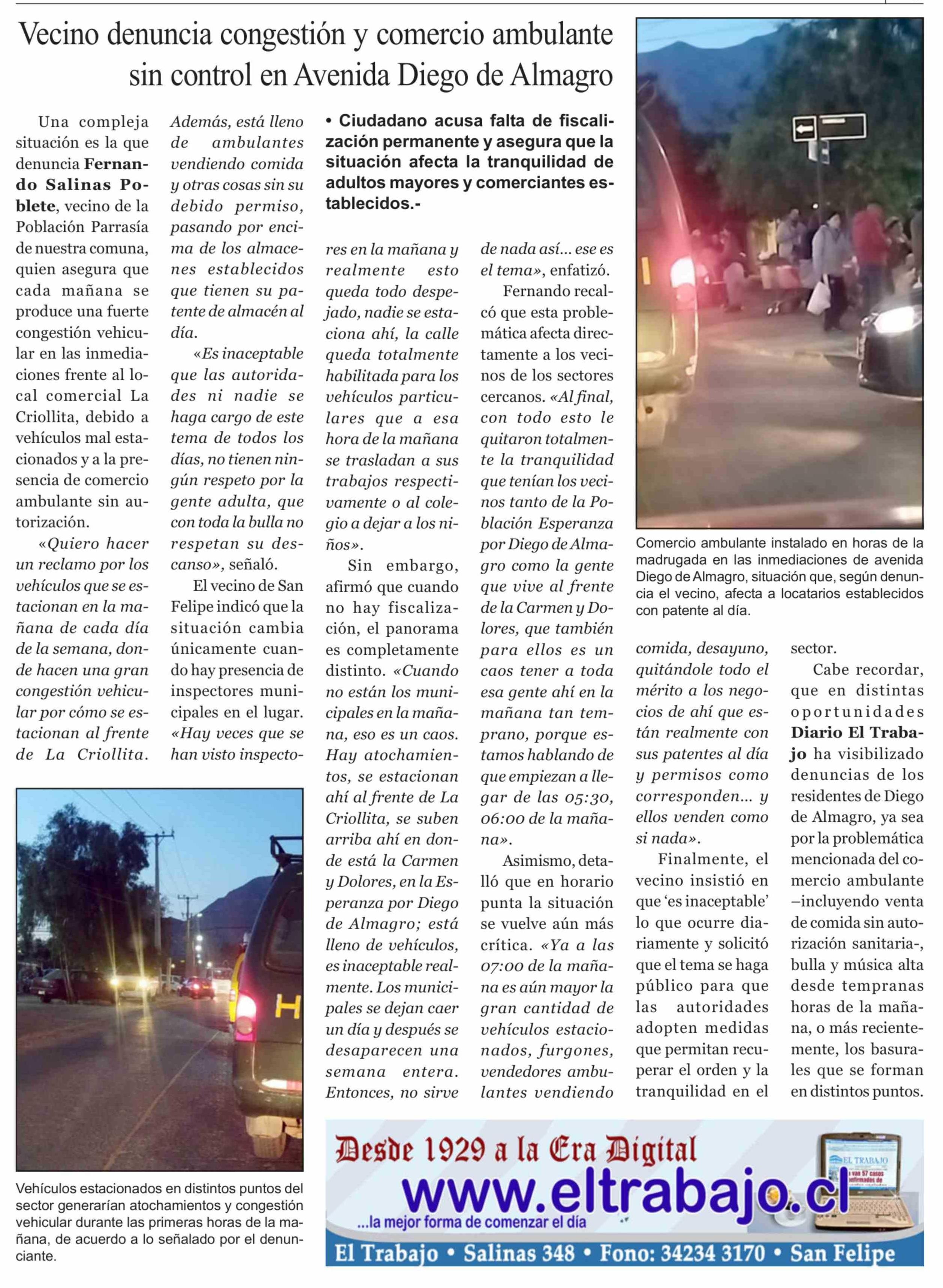 Vecino denuncia congestión y comercio ambulante sin control en Avenida Diego de Almagro 05-03-2026 El Trabajo |