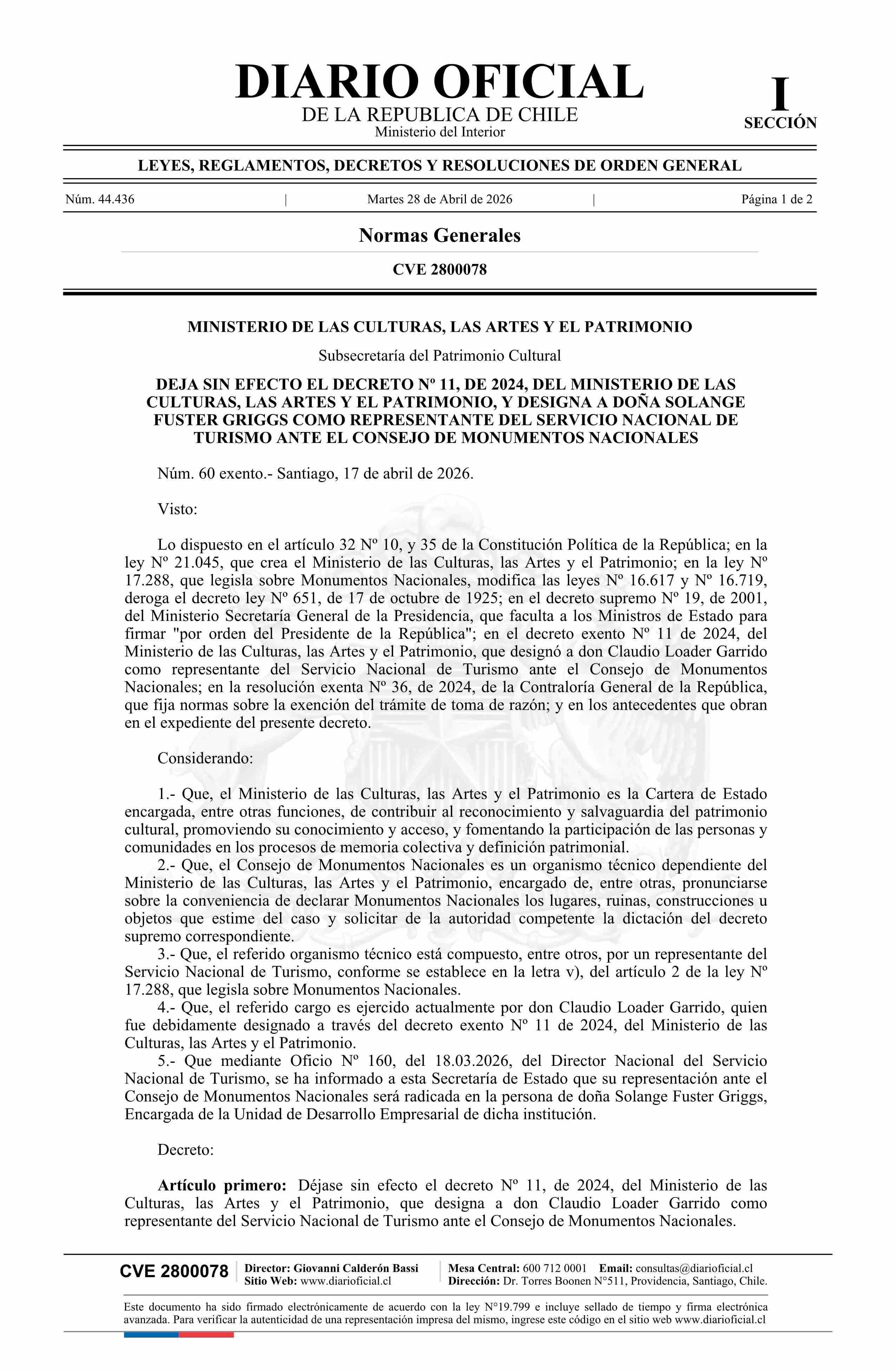 | Título: | Decreto exento número 60, de 2026.- Deja sin efecto el decreto Nº 11, de 2024, y designa a doña Solange Fuster Griggs como representante del Servicio Nacional de Turismo ante el Consejo de Monumentos Nacionales |