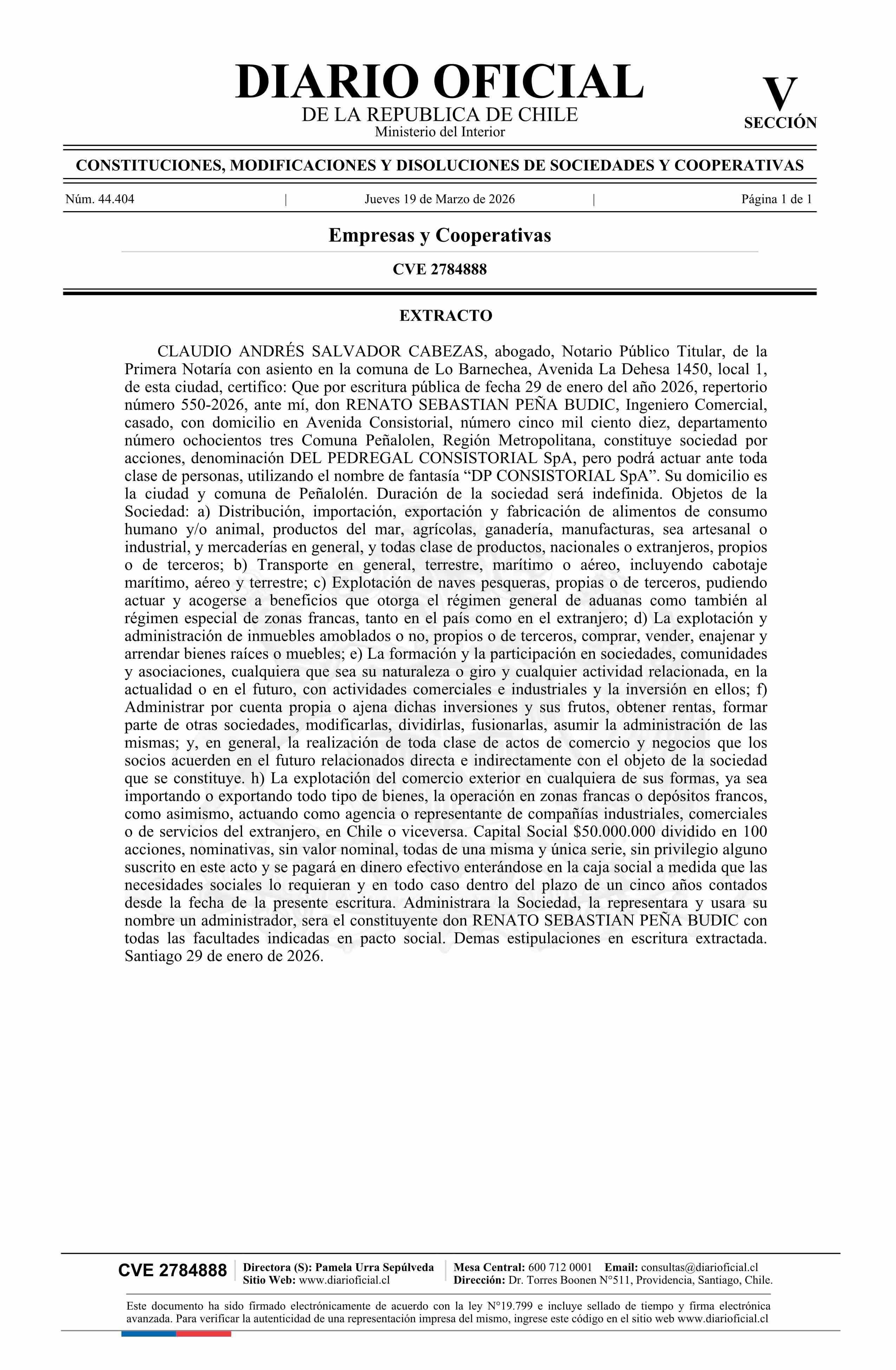 Del Pedregal Consistorial SpA 19-03-2026 Diario Oficial Edición Electrónica |