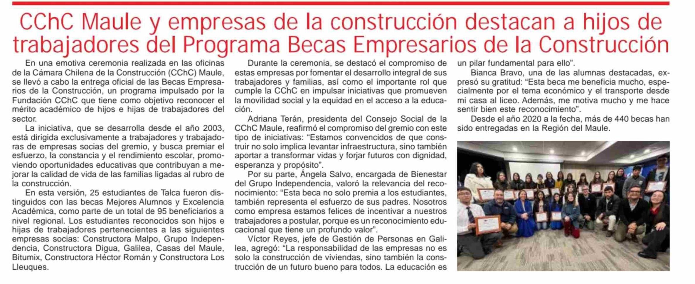 CChC Maule y empresas de la construcción destacan a hijos de trabajadores del Programa Becas Empresarios de la Construcción 14-06-2025 Maule Hoy |