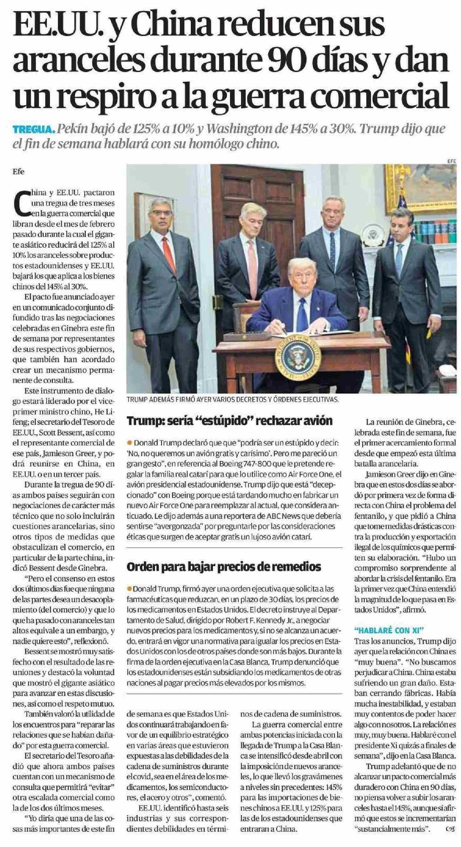 EEUU. y China reducen sus aranceles durante 90 días y dan un respiro a la guerra comercial 13-05-2025 El Mercurio de Calama |