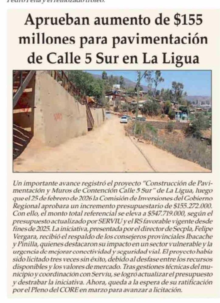 Título: Aprueban aumento de $155 millones para pavimentación de Calle 5 Sur en La Ligua