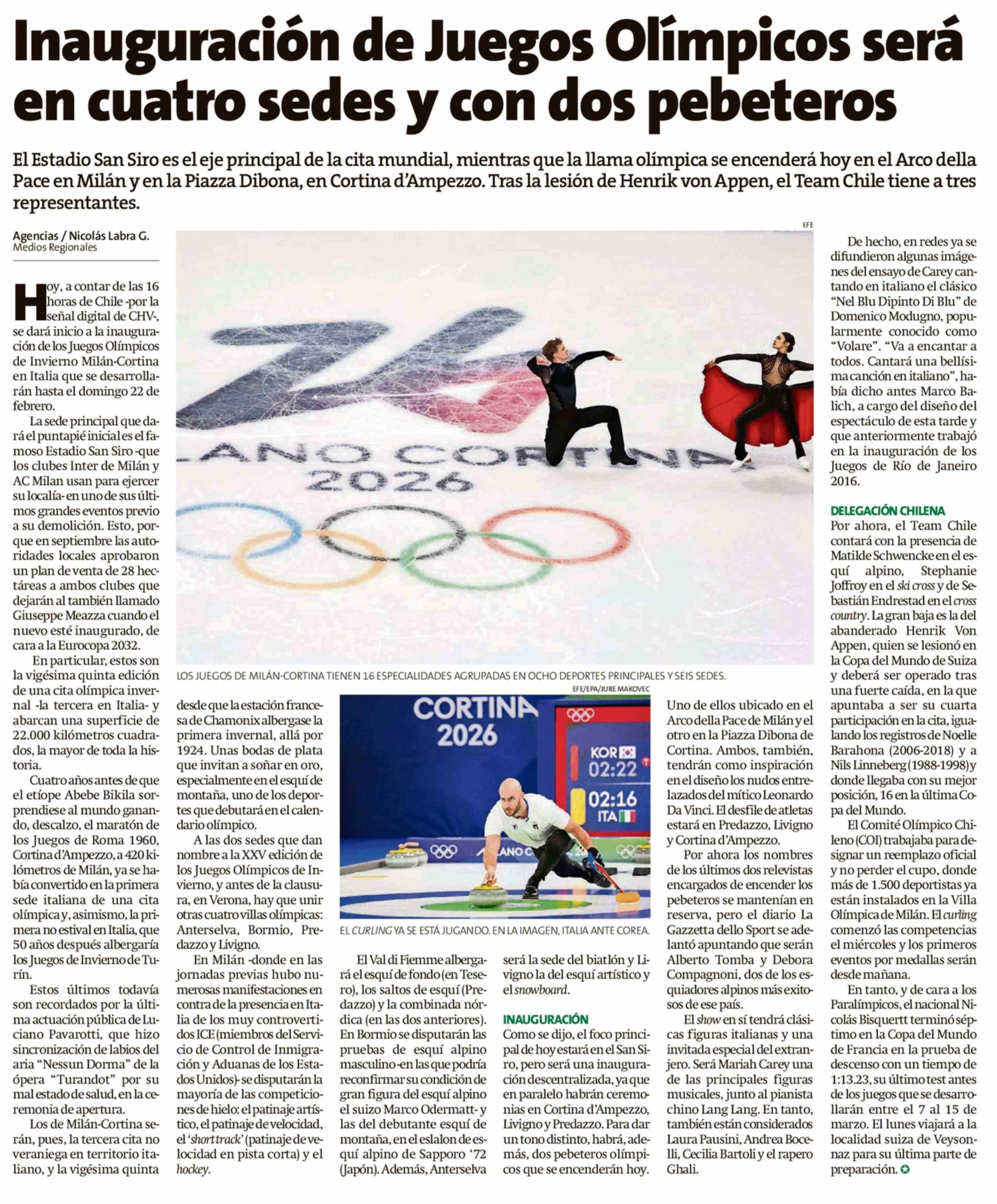 Inauguración de Juegos Olímpicos será en cuatro sedes y con dos pebeteros 06-02-2026 La Estrella de Chiloé |