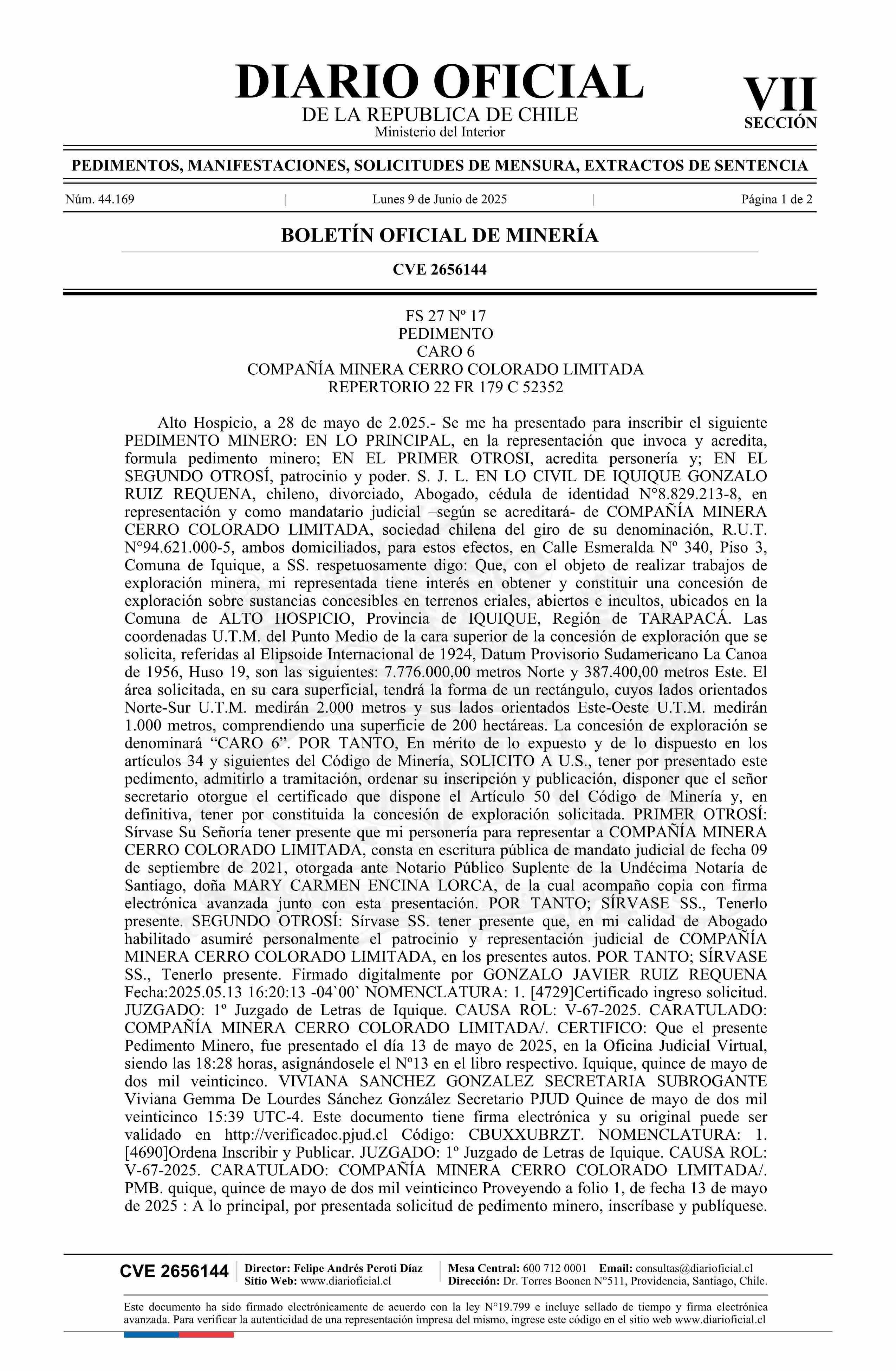 CARO 6 / Compañía Minera Cerro Colorado Limitada 09-06-2025 DIARIO OFICIAL CHILE - BOLETÍN OFICIAL DE MINERÍA |