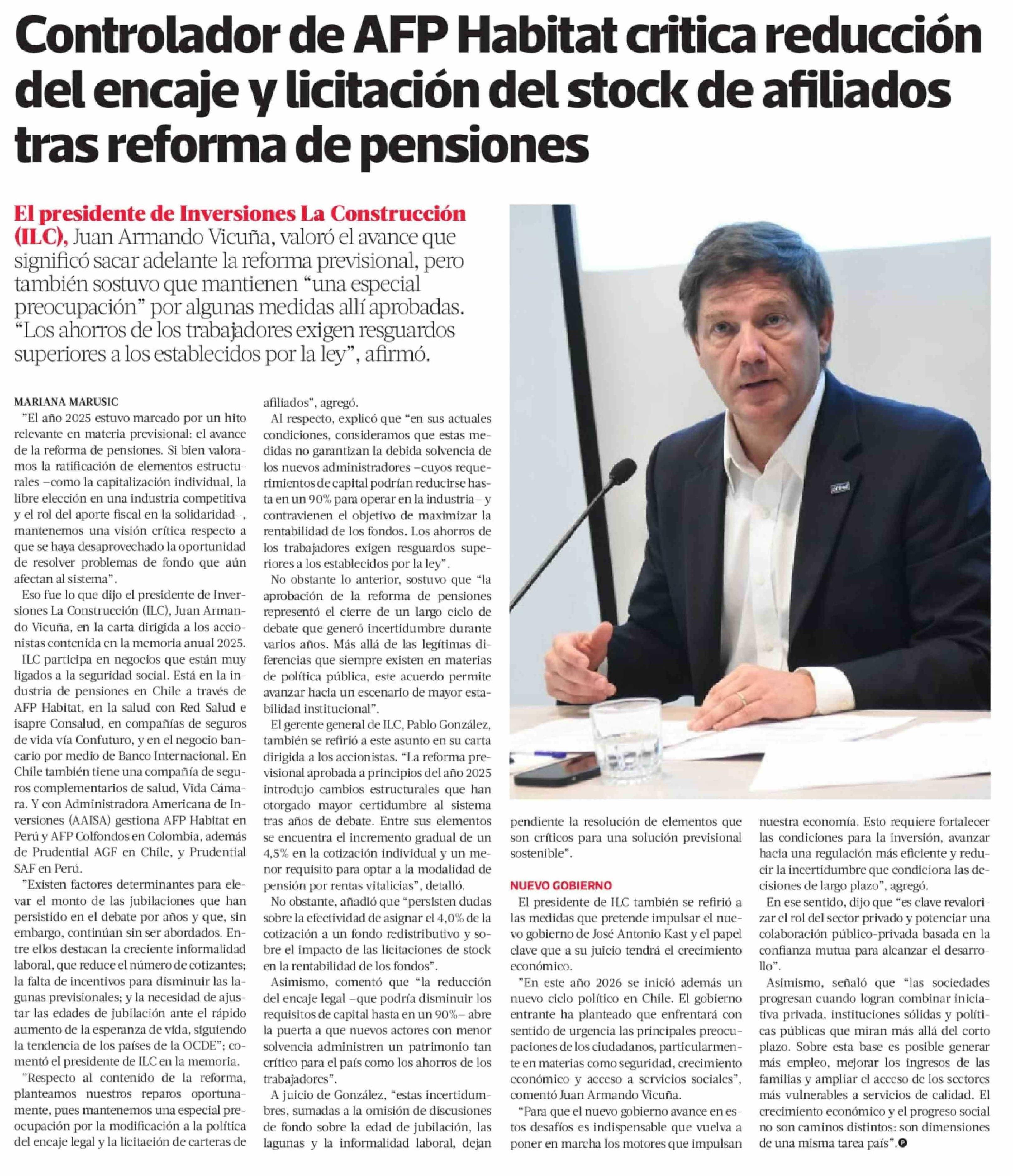 Controlador de AFP Habitat critica reducción del encaje y licitación del stock de afiliados tras reforma de pensiones 07-04-2026 La Tercera |