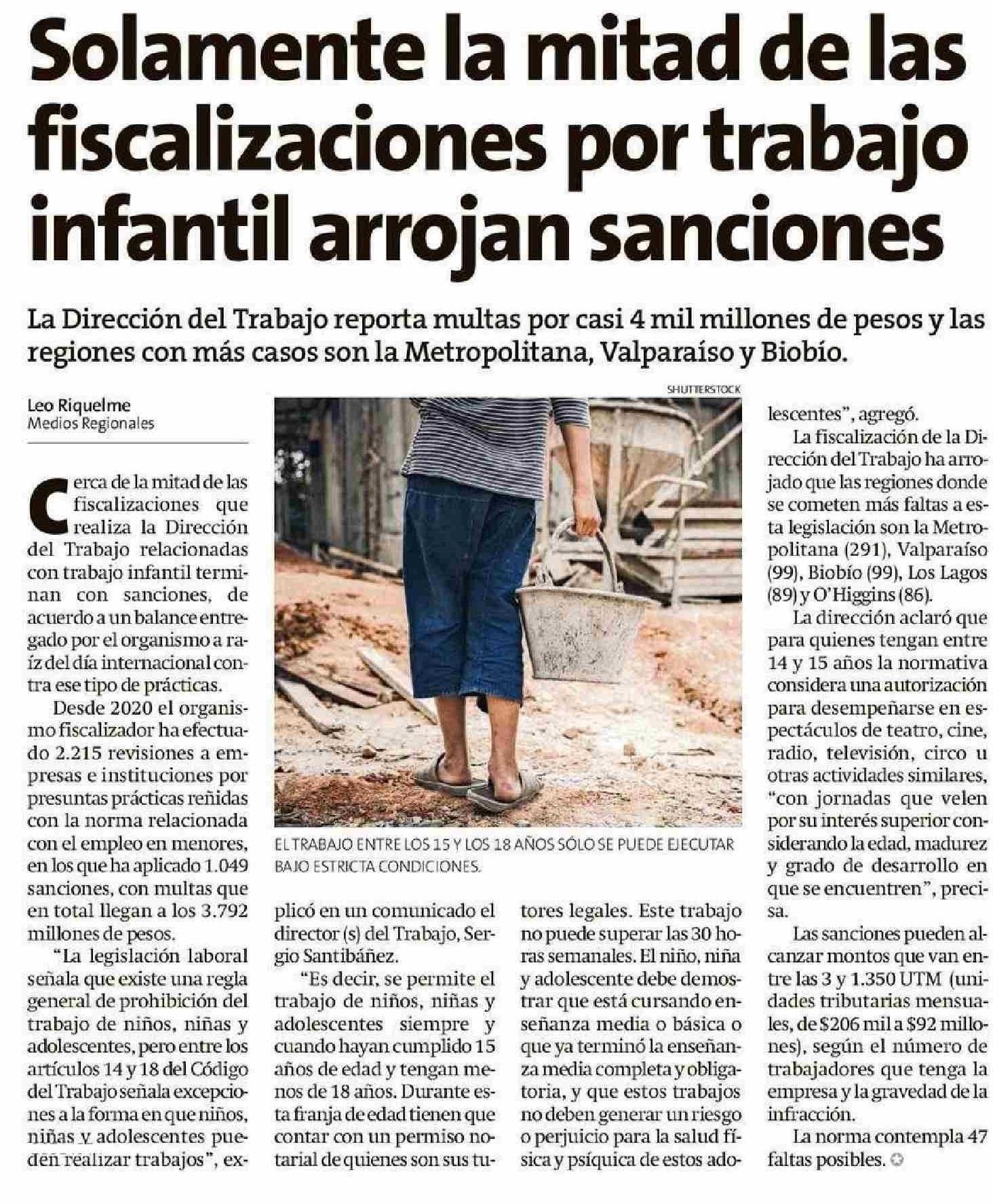 Solamente la mitad de las fiscalizaciones por trabajo infantil arrojan sanciones 16-06-2025 La Estrella de Chiloé |
