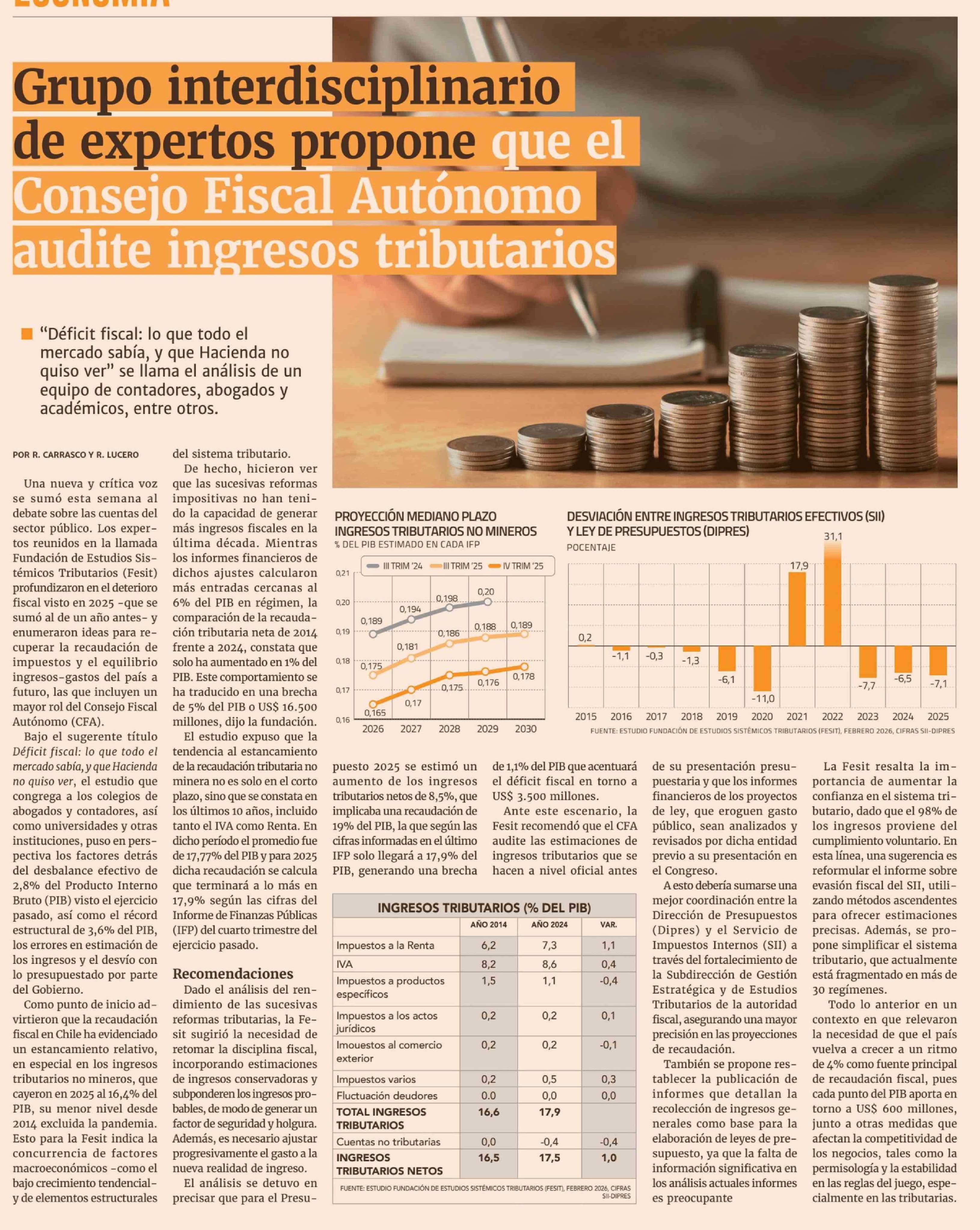 Grupo interdisciplinario de expertos propone que el Consejo Fiscal Autónomo audite ingresos tributarios 25-02-2026 Diario Financiero |