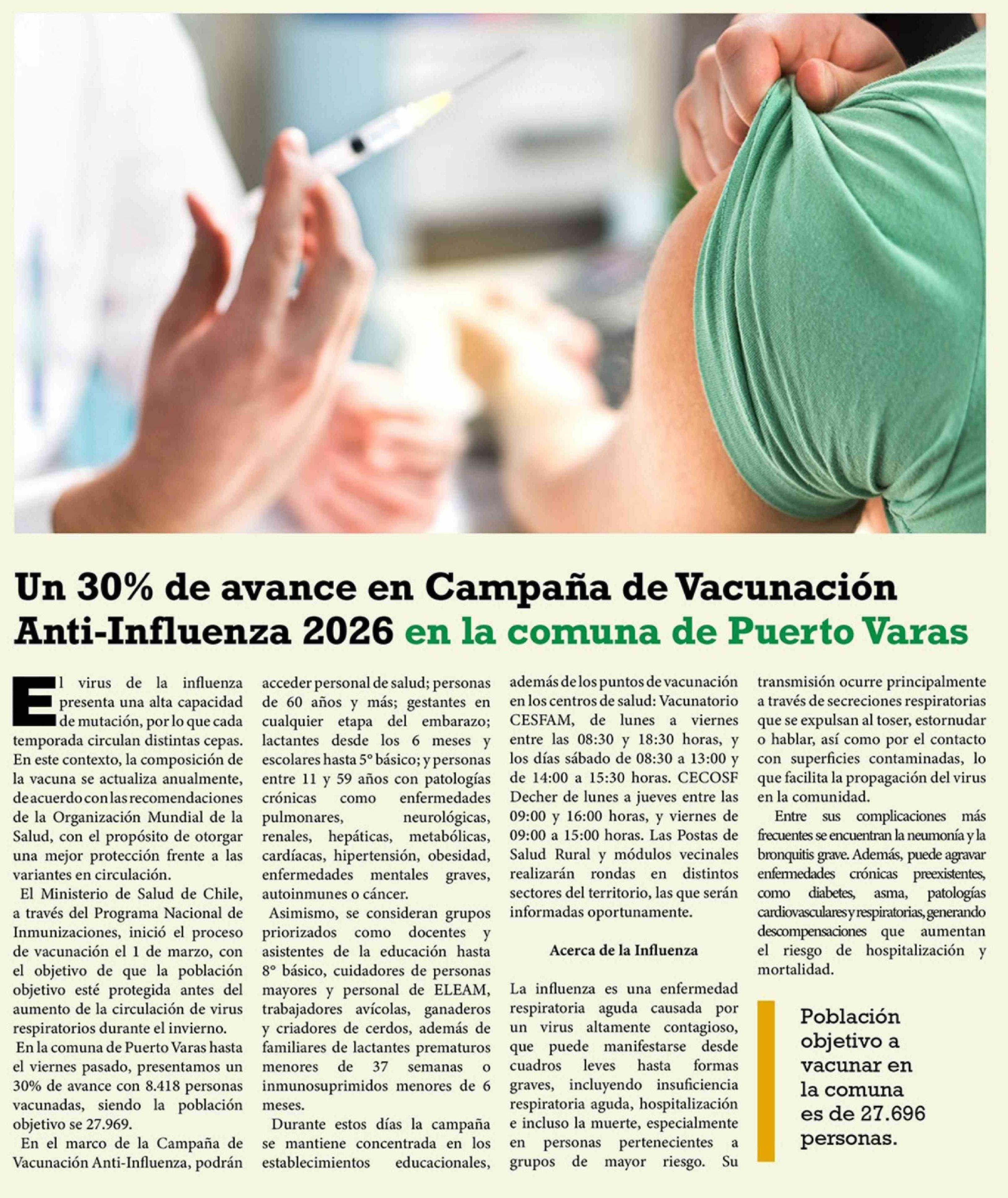 Un 30% de avance en Campaña de Vacunación Anti-Influenza 2026 en la comuna de Puerto Varas 31-03-2026 El Heraldo Austral |