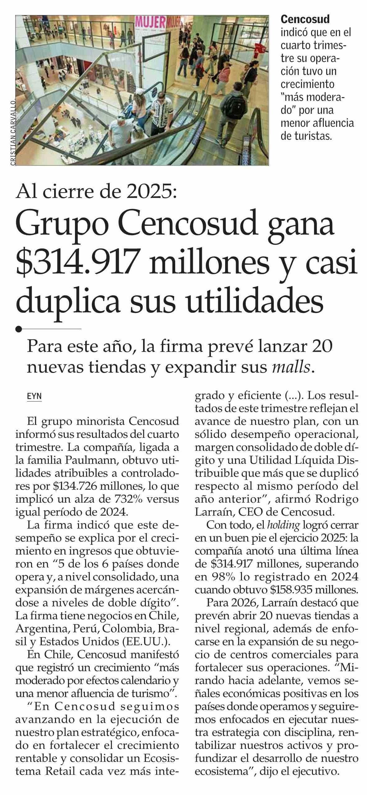 Grupo Cencosud gana $314.917 millones y casi duplica sus utilidades 06-02-2026 El Mercurio |