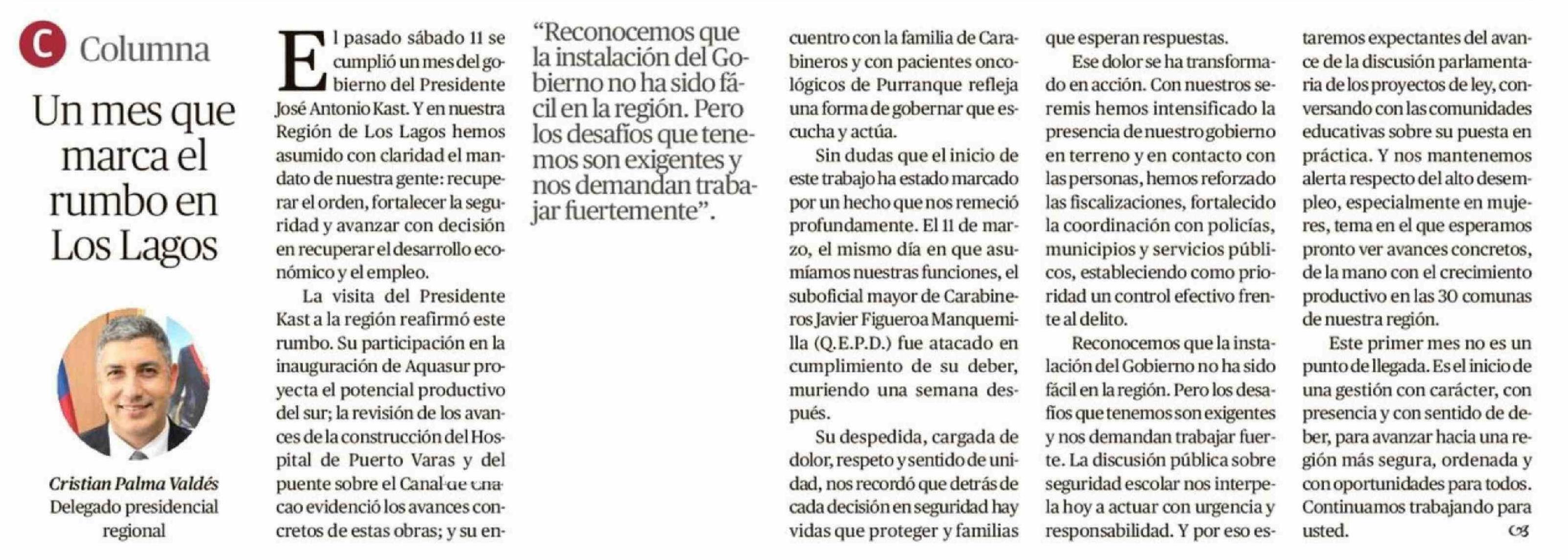 | Título: | Columnas de Opinión: Un mes que marca el rumbo en Los Lagos |