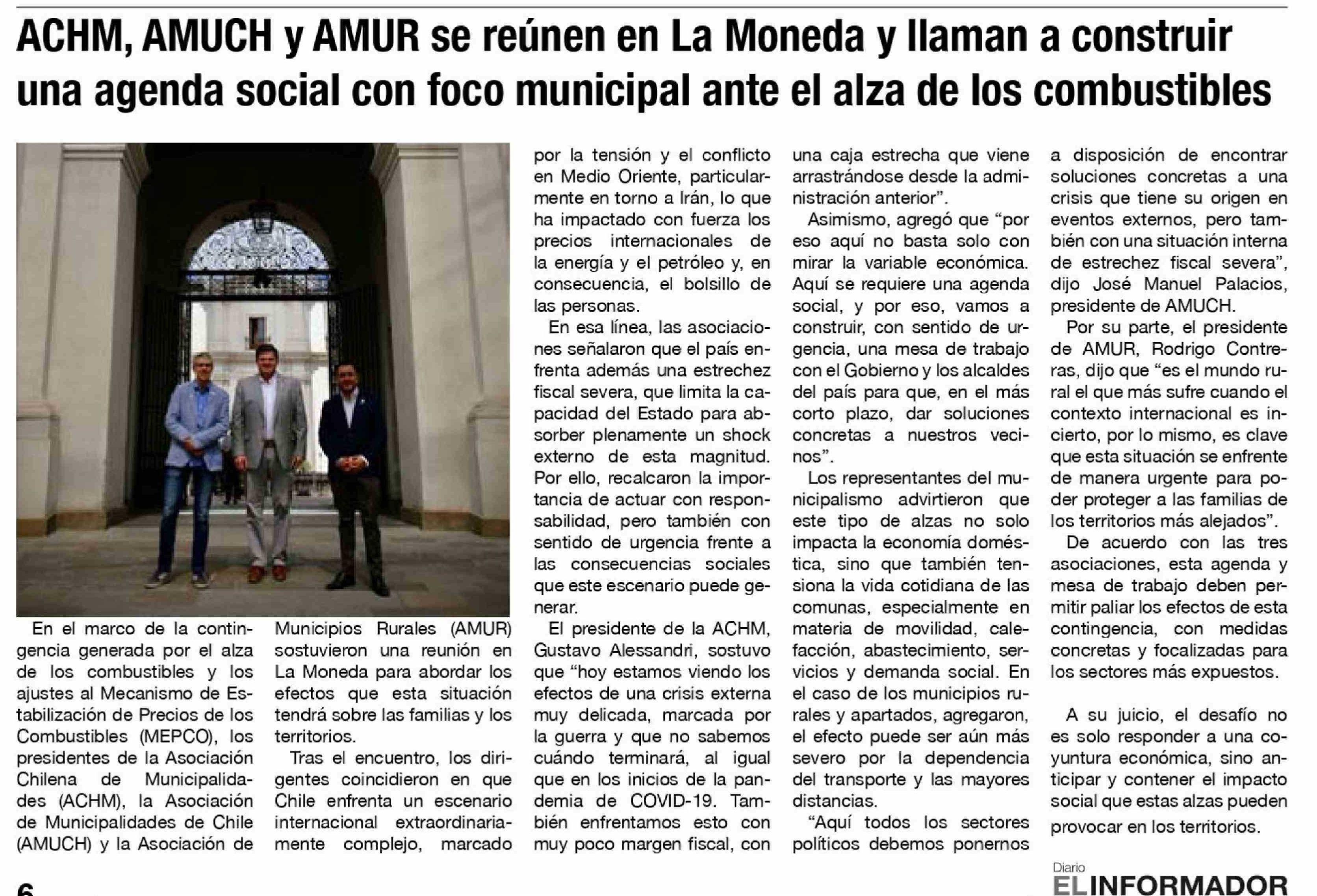ACHM, AMUCH y AMUR se reúnen en La Moneda y llaman a construir una agenda social con foco municipal ante el alza de los combustibles 25-03-2026 El Informador |