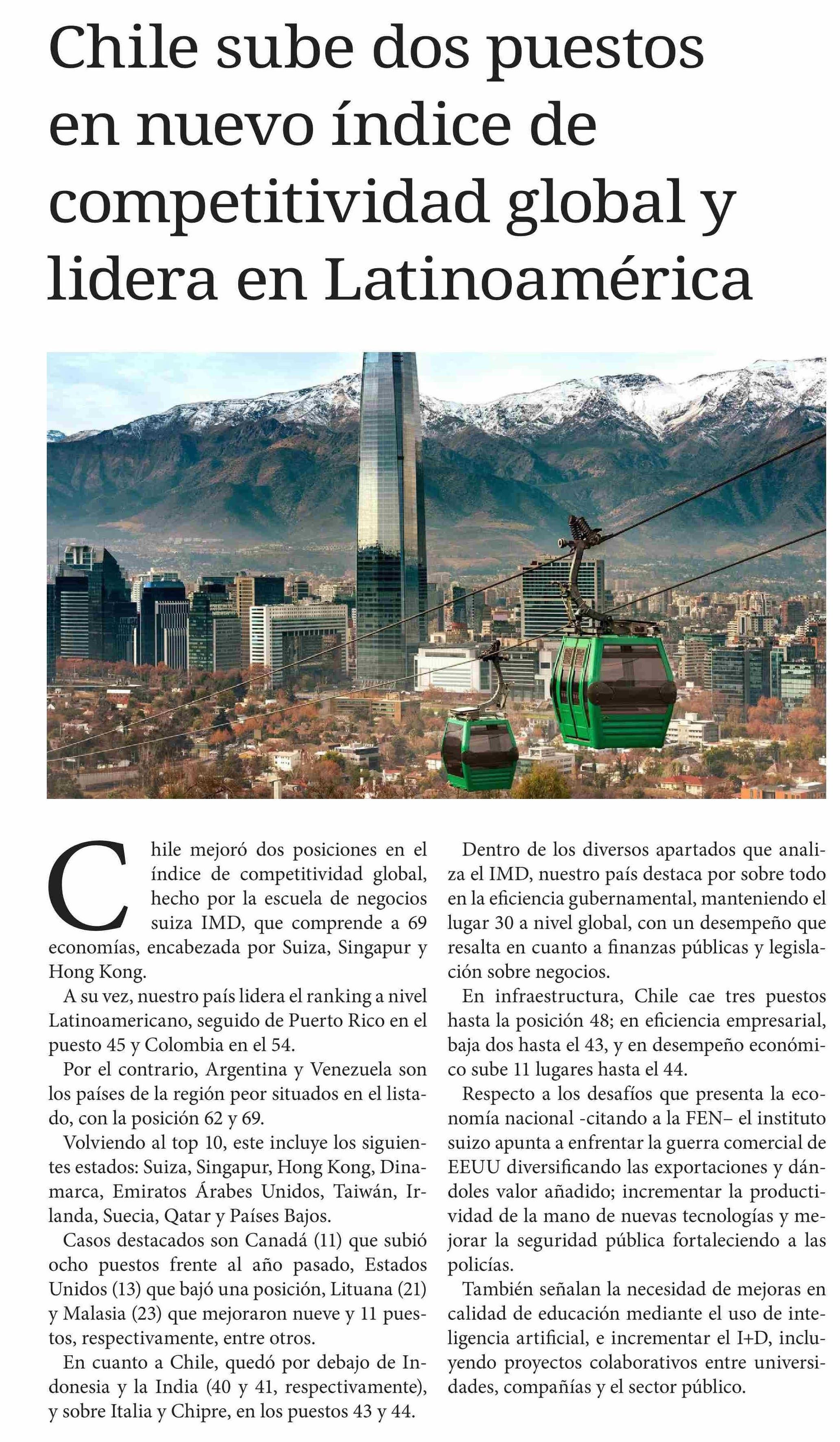 Chile sube dos puestos en nuevo índice de competitividad global y lidera en Latinoamérica 18-06-2025 Diario Chañarcillo |