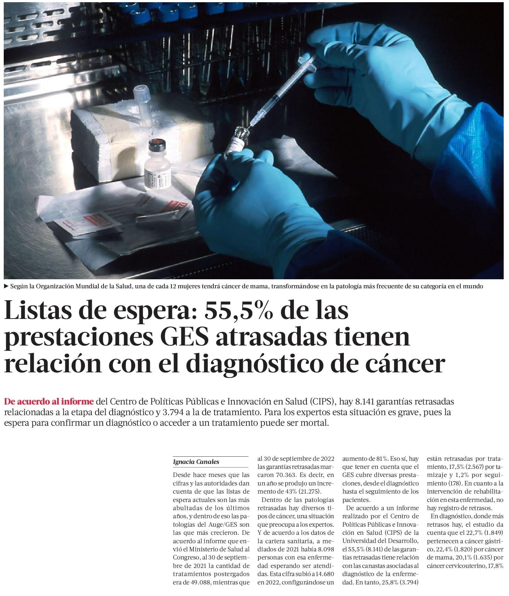 Listas de espera: 55,5 % de las prestaciones GES atrasadas tienen relación con el diagnóstico de cáncer 27-01-2023 La Tercera |