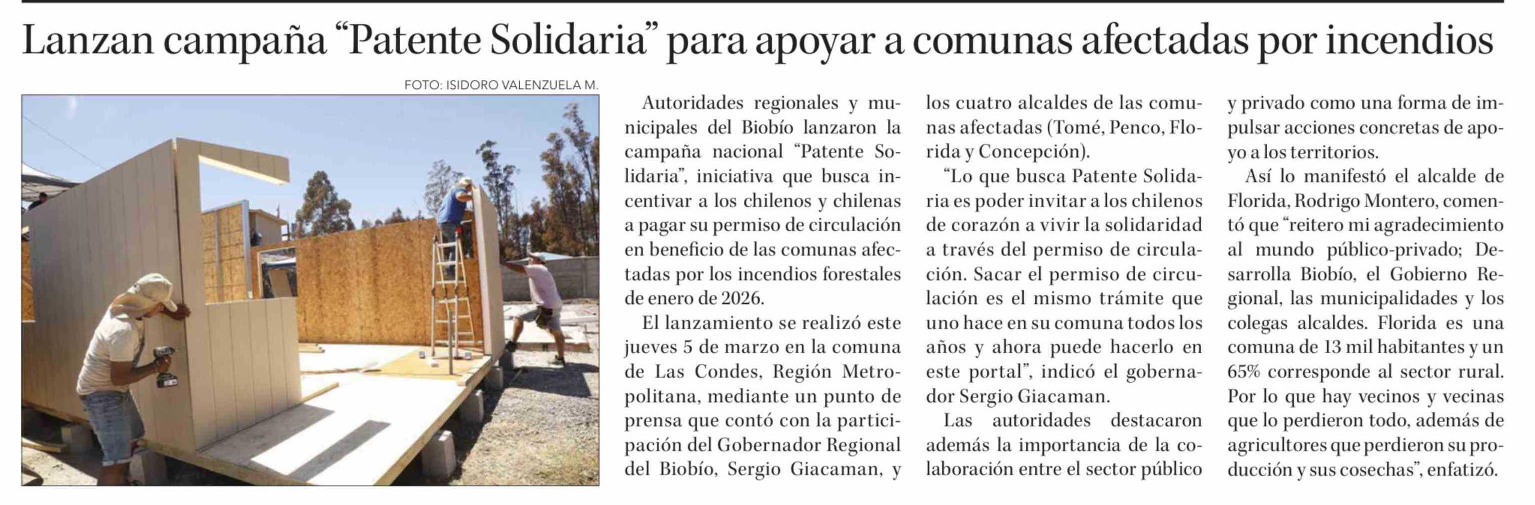 Lanzan campaña "Patente Solidaria" para apoyar a comunas afectadas por incendios 08-03-2026 Diario Concepción |