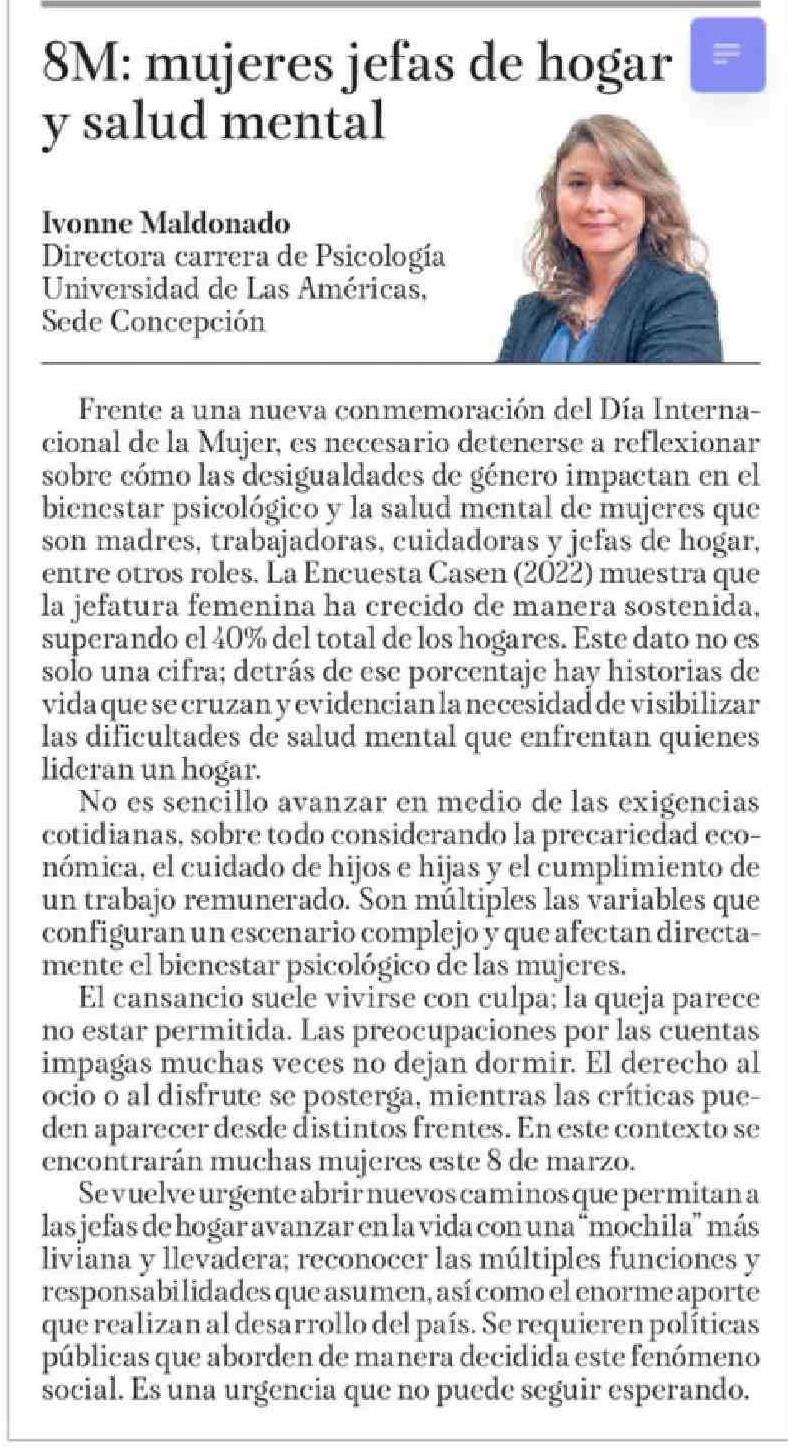 Título: Columnas de Opinión: 8M: mujeres jefas de hogar y salud mental