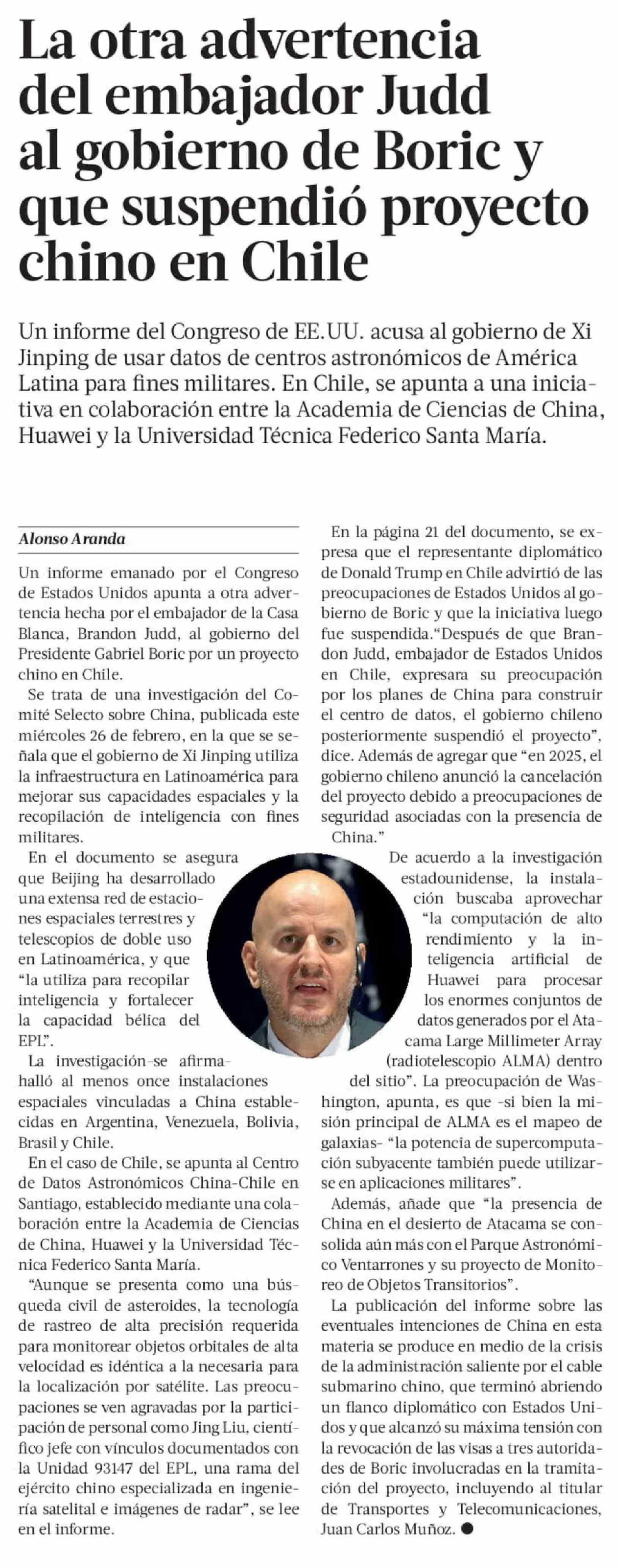 La otra advertencia del embajador Judd al gobierno de Boric y que suspendió proyecto chino en Chile 28-02-2026 La Tercera |