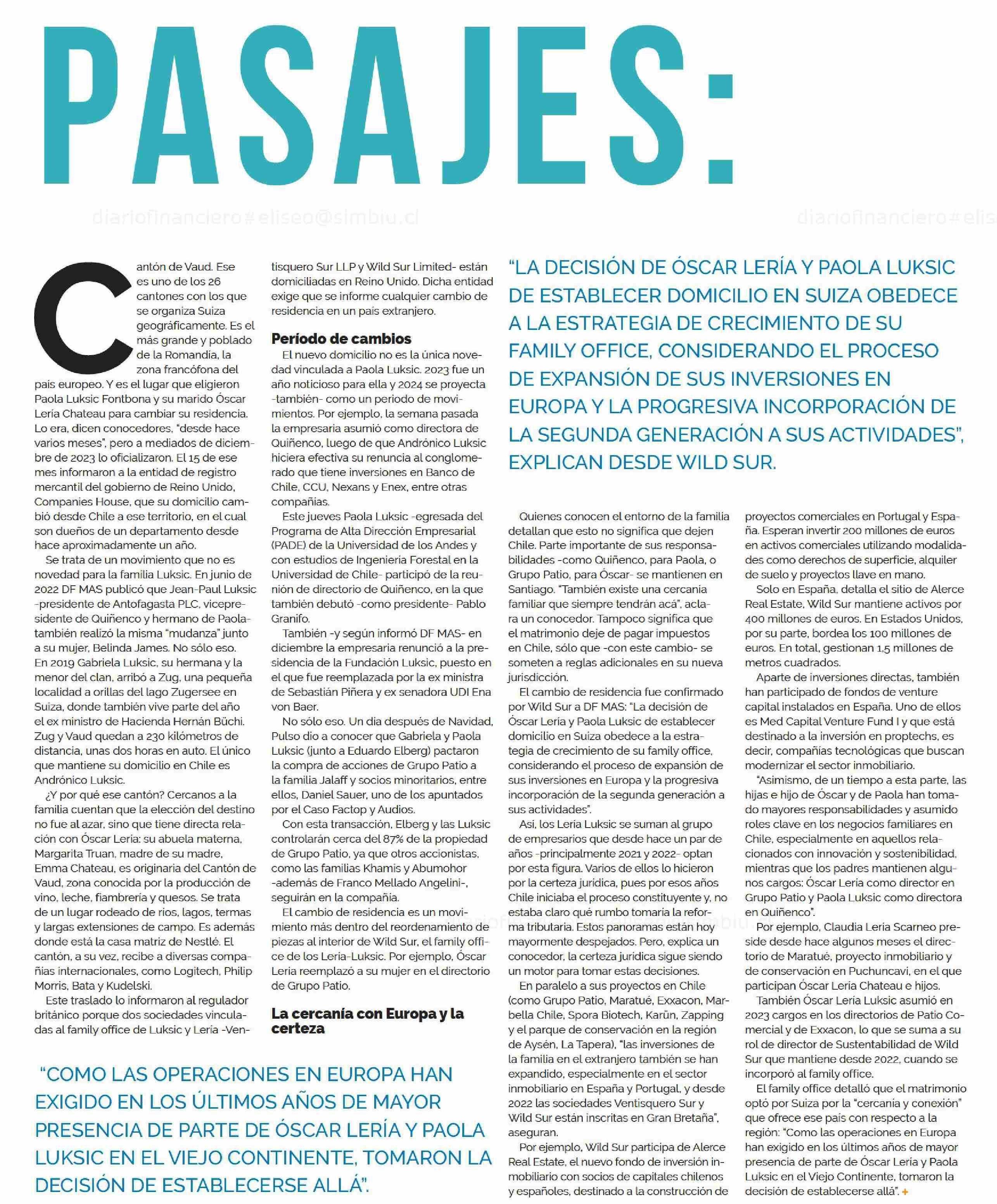 Título: A SUIZA LOS PASAJES: PAOLA LUKSIC Y ÓSCAR LERIA CAMBIAN SU RESIDENCIA AL CANTON DE VAUD