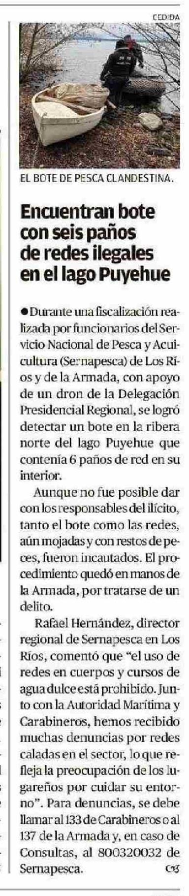 | Título: | Encuentran bote con seis paños de redes ilegales en el lago Puyehue |