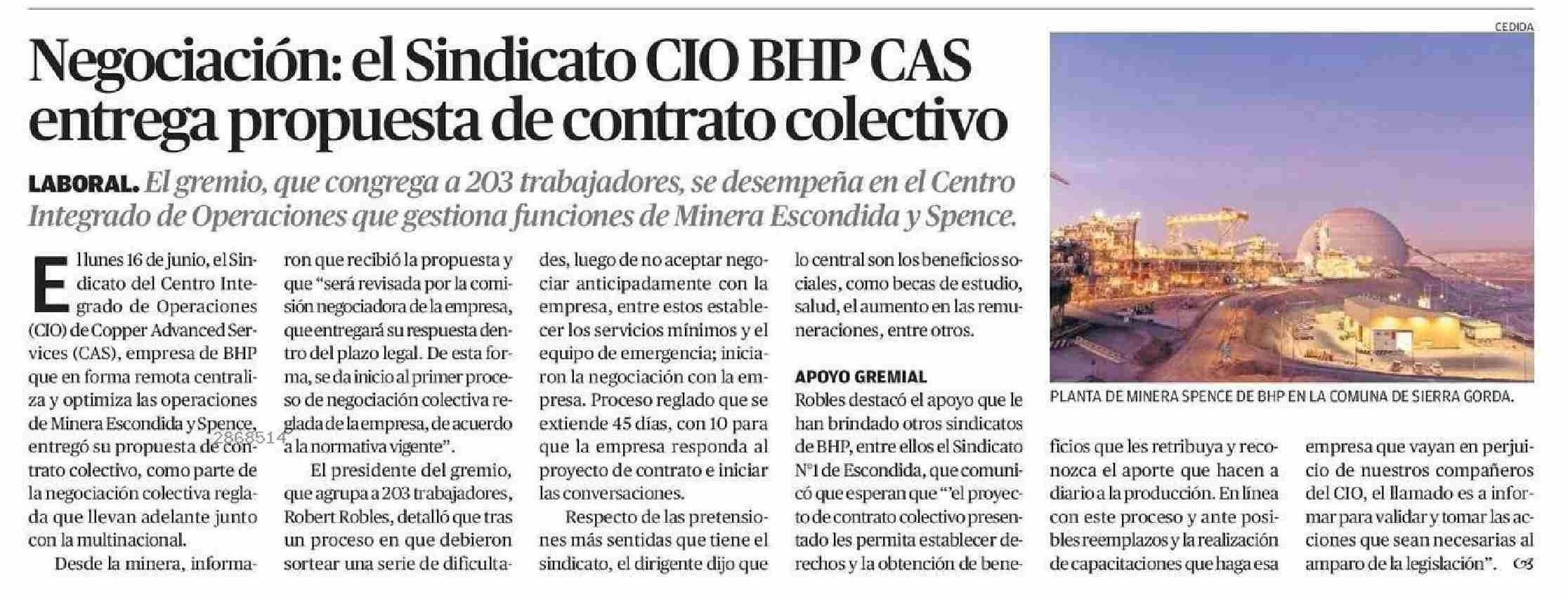 Negociación: el Sindicato CIO BHP CAS entrega propuesta de contrato colectivo 21-06-2025 El Mercurio de Antofagasta |