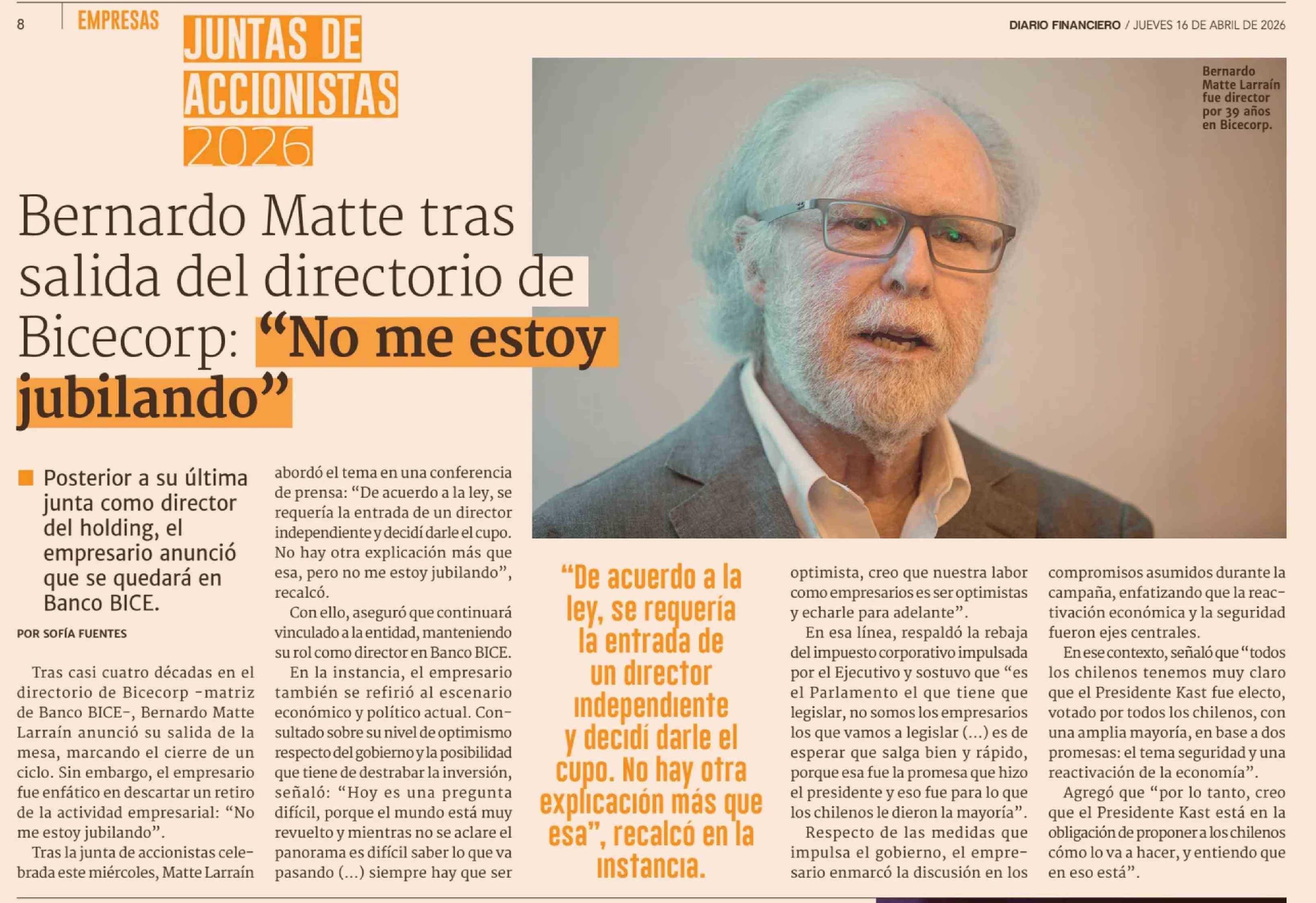 Bernardo Matte tras salida del directorio de Bicecorp: "No me estoy jubilando" 16-04-2026 Diario Financiero |