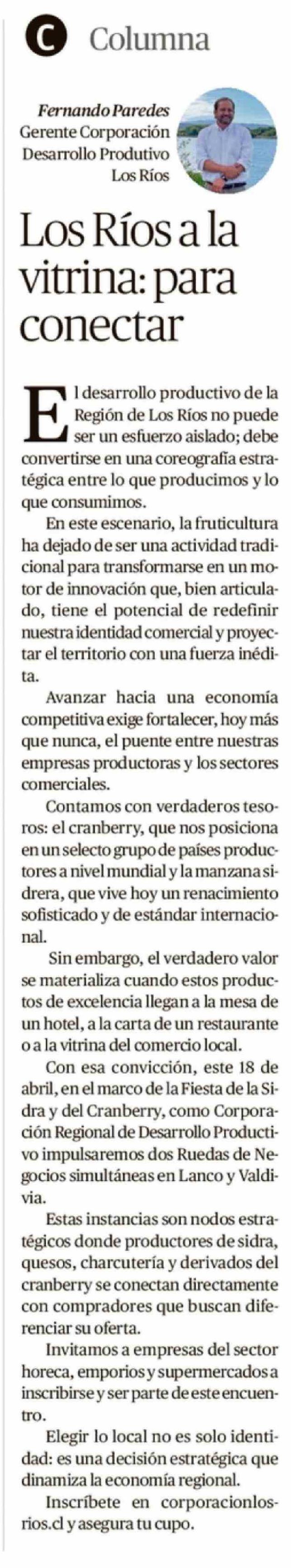 Columnas de Opinión: Los Ríos a la vitrina: para conectar 14-04-2026 Diario Austral Región de Los Ríos |