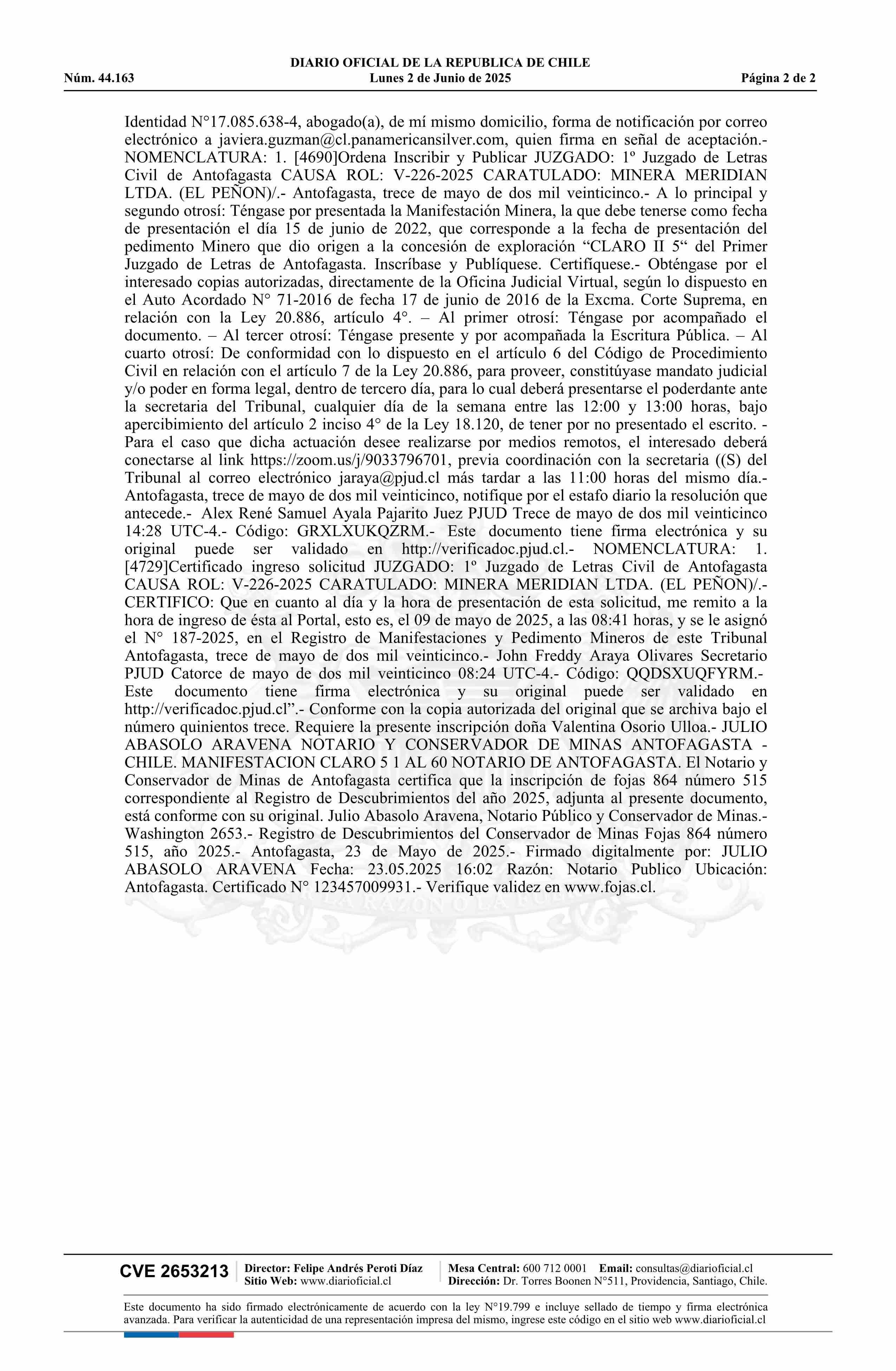 CLARO 5 1 AL 60 / Minera Meridian Limitada 02-06-2025 DIARIO OFICIAL CHILE - BOLETÍN OFICIAL DE MINERÍA |