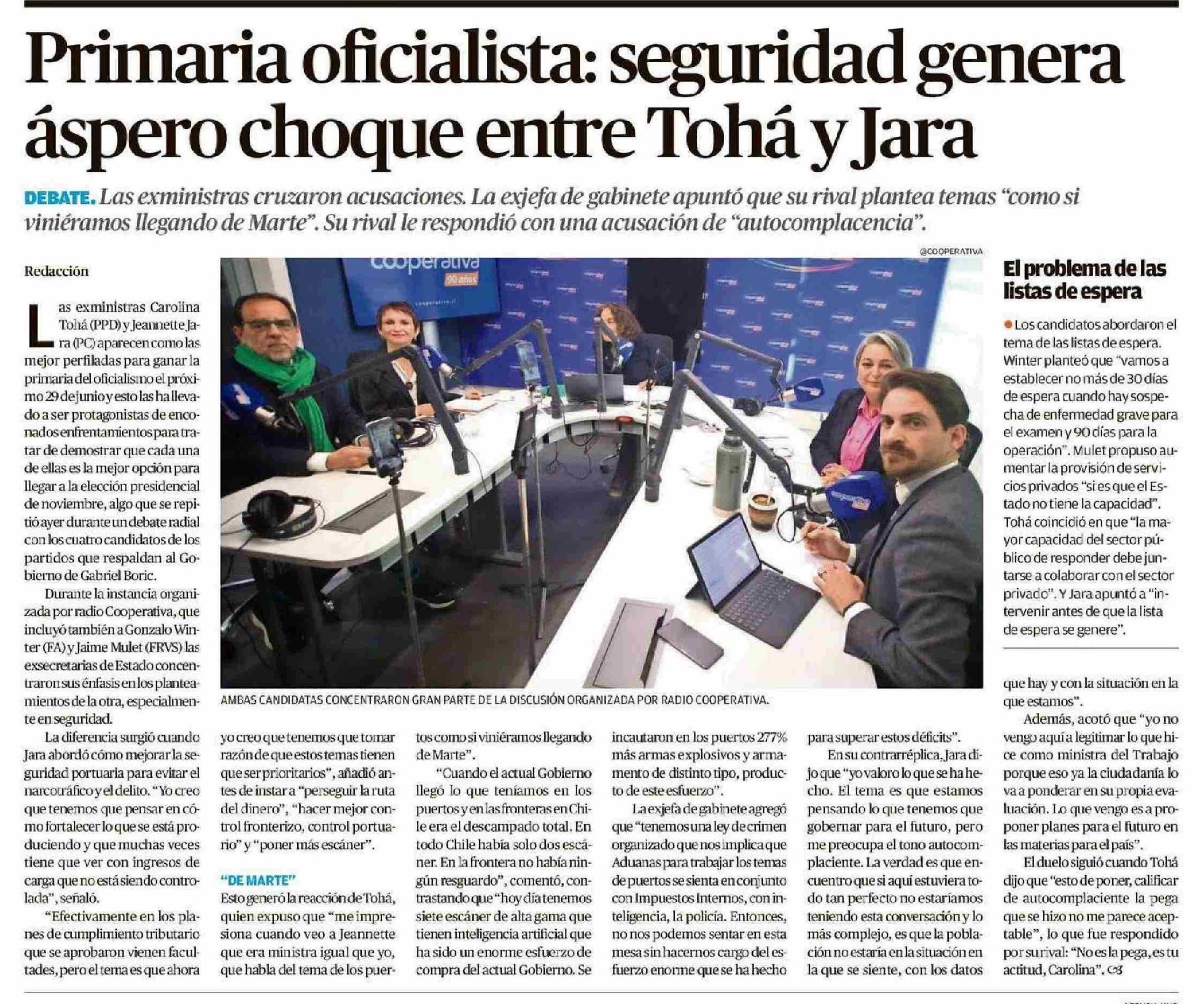 Primaria oficialista: seguridad genera áspero choque entre Tohá y Jara 19-06-2025 El Austral de Osorno |
