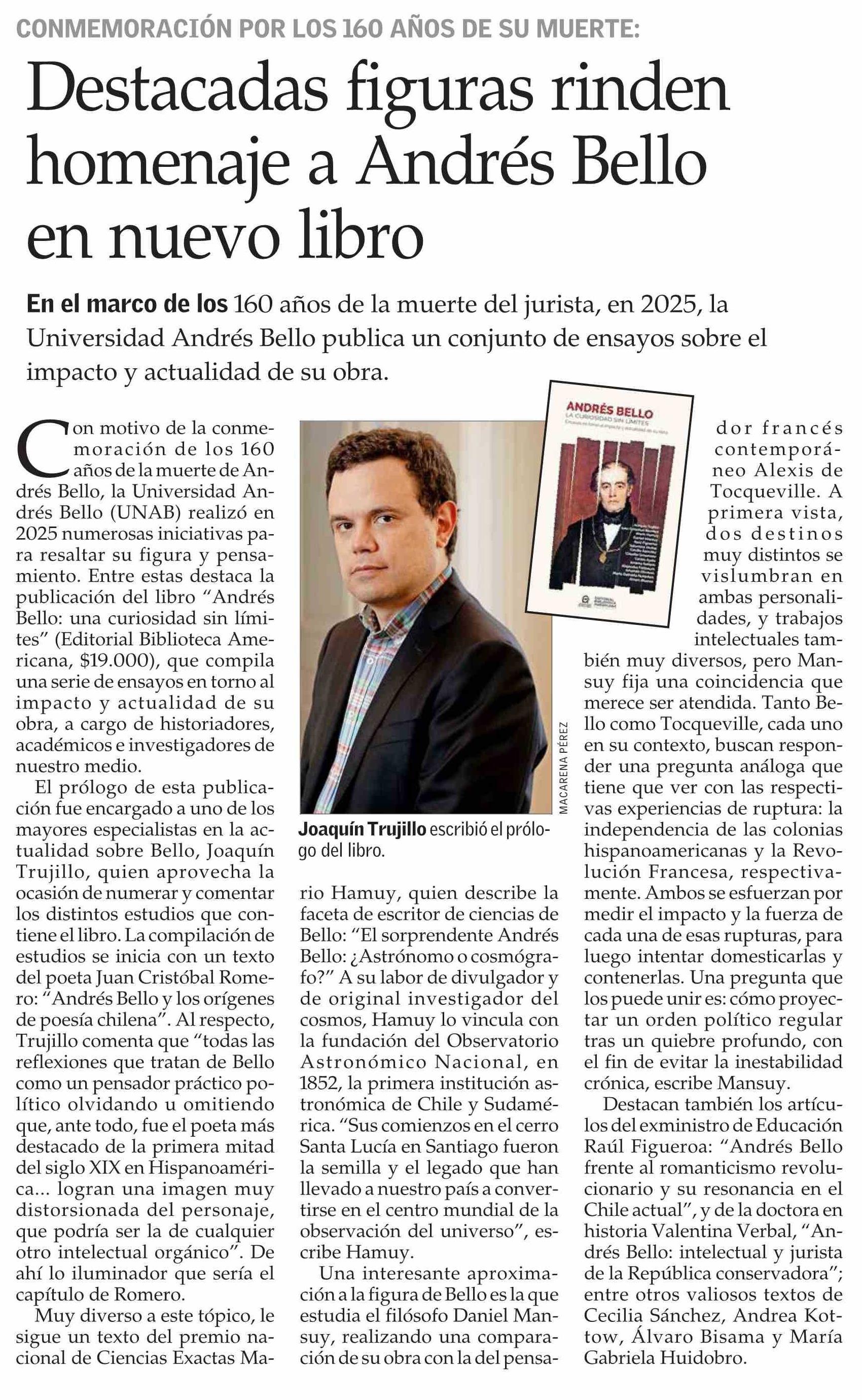 Destacadas figuras rinden homenaje a Andrés Bello en nuevo libro 16-01-2026 El Mercurio |