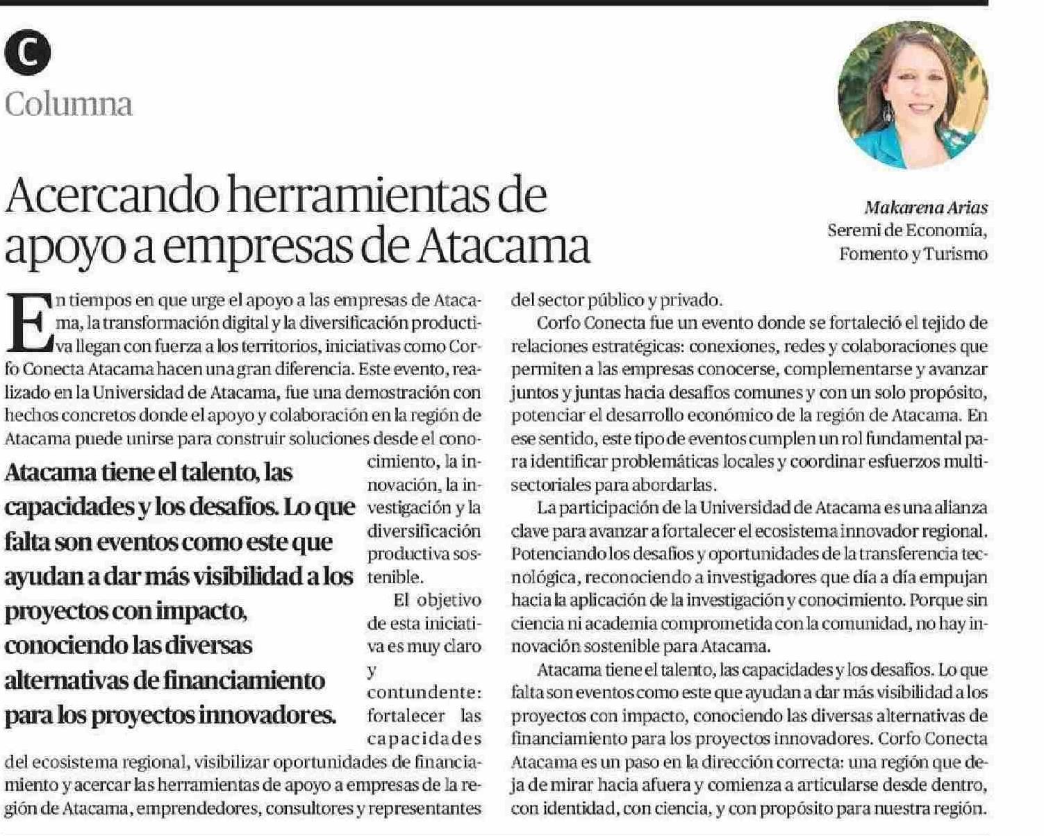 COLUMNAS DE OPINIÓN: Acercando herramientas de apoyo a empresas de Atacama 28-05-2025 El Diario de Atacama |