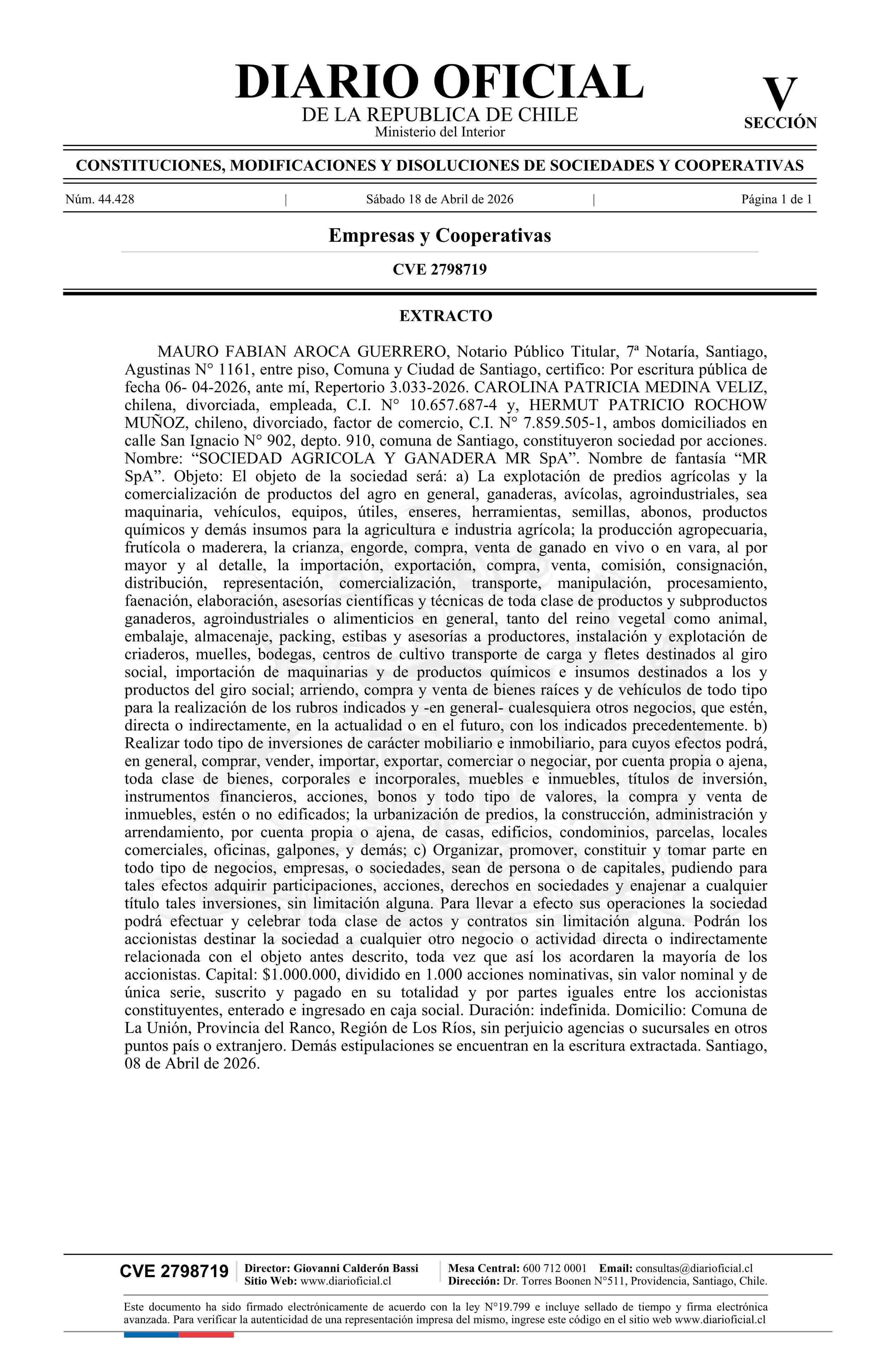 Título: SOCIEDAD AGRICOLA Y GANADERA MR SpA